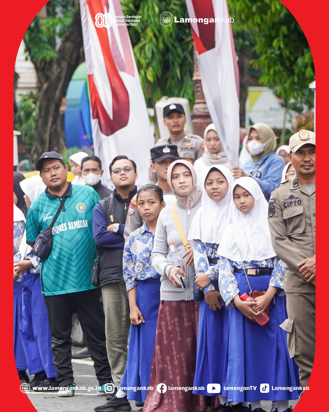Sebanyak 117 regu siswa tingkat SMP dan SMA sederajat se-Kabupaten Lamongan ambil bagian dalam lomba gerak jalan memperingati HUT ke-80 Republik Indonesia. Diberangkatkan secara langsung oleh Bupati Lamongan Yuhronur Efendi, di depan Pendopo Lokatantra, Rabu (20/8/2025).
