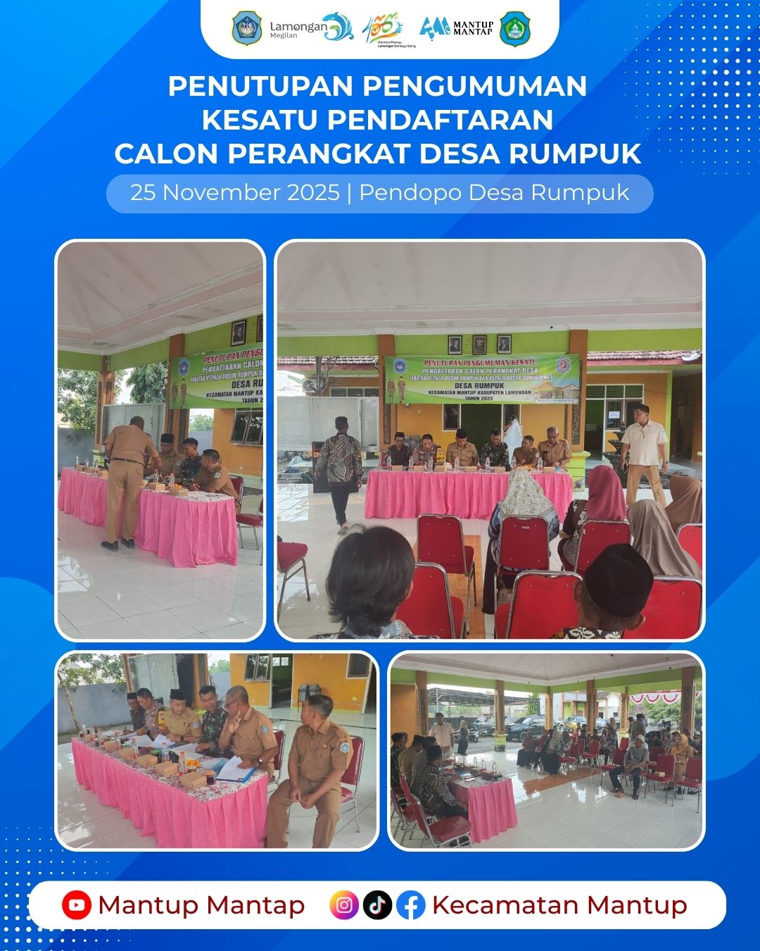 Pemerintah Desa Rumpuk, Kecamatan Mantup, secara resmi menutup tahapan Pengumuman Kesatu Pendaftaran Calon Perangkat Desa pada (Selasa, 25/11/2025) bertempat di Pendopo Desa Rumpuk.