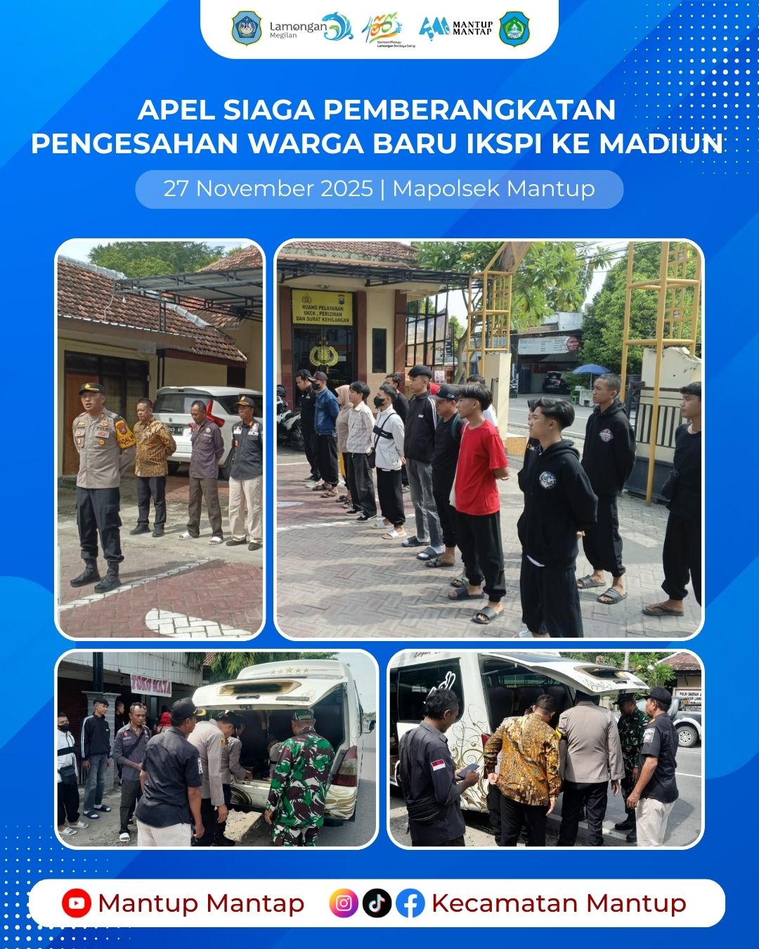 Polsek Mantup bersama unsur Forkopimcam melaksanakan Apel Siaga Pemberangkatan Pengesahan Warga Baru IKSPI bertempat di halaman Mapolsek Mantup pada (Kamis, 27/11/2025), sebelum rombongan diberangkatkan menuju lokasi pengesahan di Kabupaten Madiun.