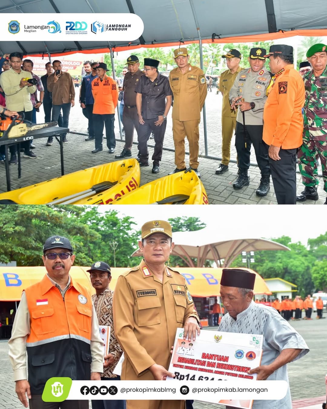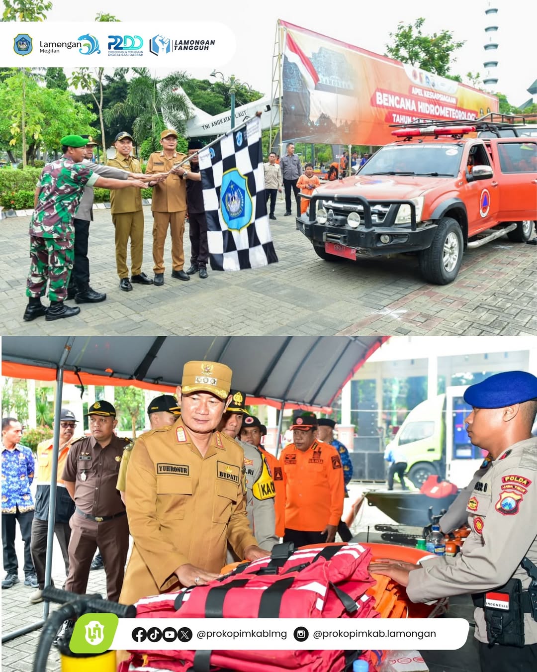 Memasuki musim pancaroba dengan adanya potensi cuaca ekstrem di wilayah Lamongan, Bupati Lamongan, Yuhronur Efendi, melaksanakan Apel Kesiapsiagaan Bencana Hidrometeorologi Tahun 2025-2026, yang dilanjutkan dengan peninjauan sarana dan prasarana, serta pemberangkatan pasukan kesiapsiagaan bencana, di Alun-Alun Kabupaten Lamongan, Senin (17/11). Pada kesempatan tersebut, Bupati yang akrab disapa Pak Yes menegaskan terkait pentingnya meningkatkan sinergitas, kewaspadaan, serta mitigasi, melalui 7 elemen strategis dalam menghadapi kemungkinan terjadinya bencana.