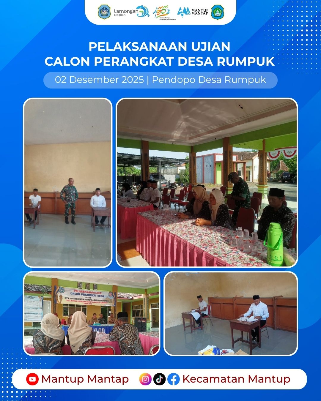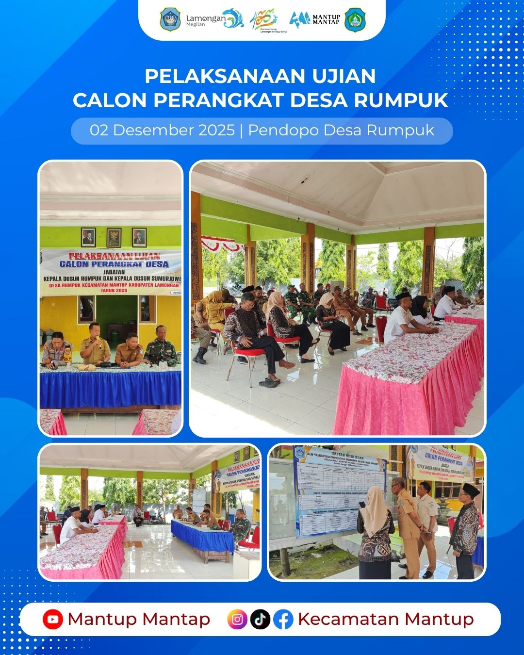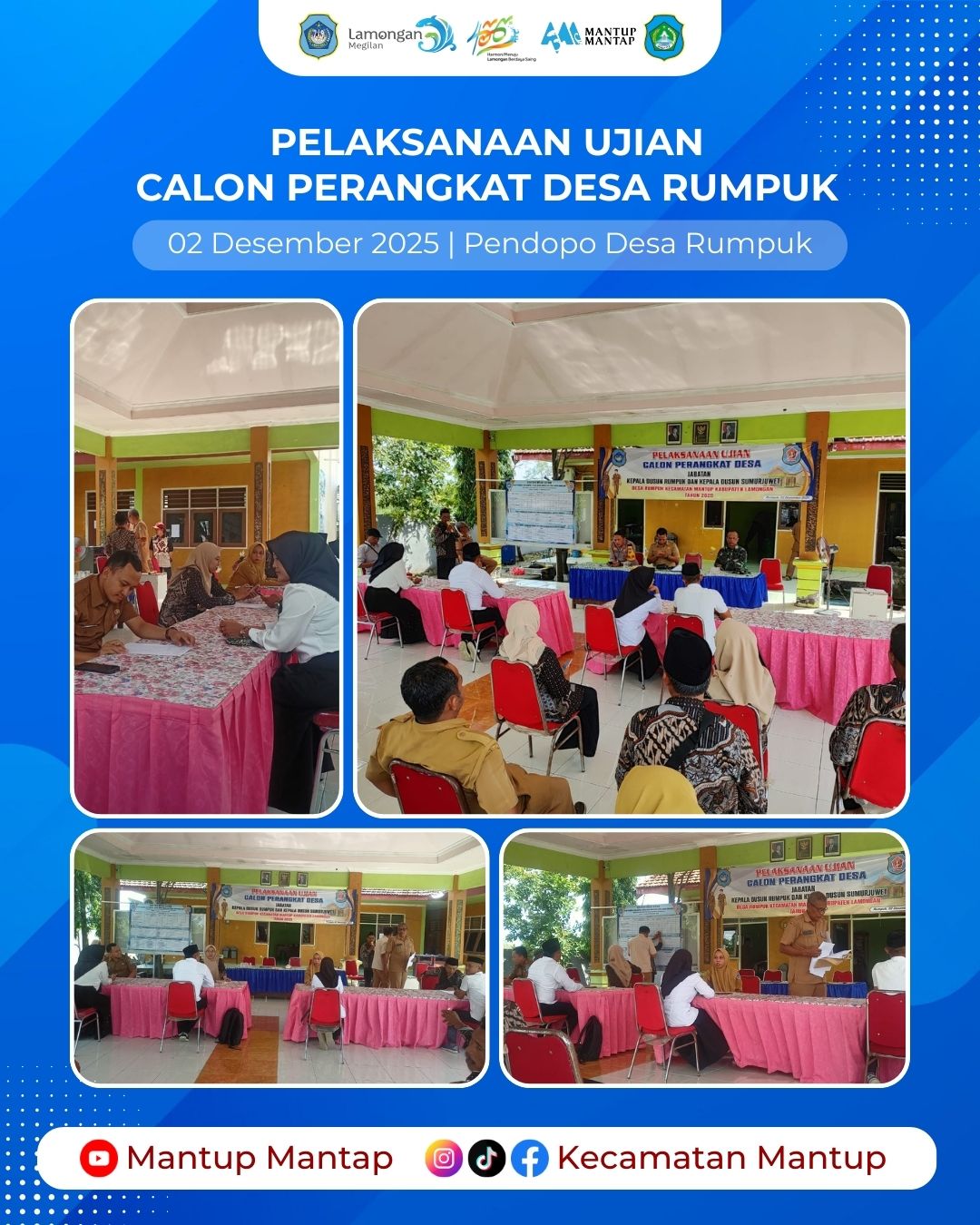 Untuk mendapatkan individu yang memiliki pengetahuan, keterampilan, dan sikap kerja yang sesuai dengan kebutuhan pemerintahan desa, tim pengangkatan Perangkat Desa Rumpuk melakukan ujian calon Perangkat Desa Rumpuk tahun 2025 pada Selasa (2/12), di Pendopo Desa Rumpuk Kecamatan Mantup.