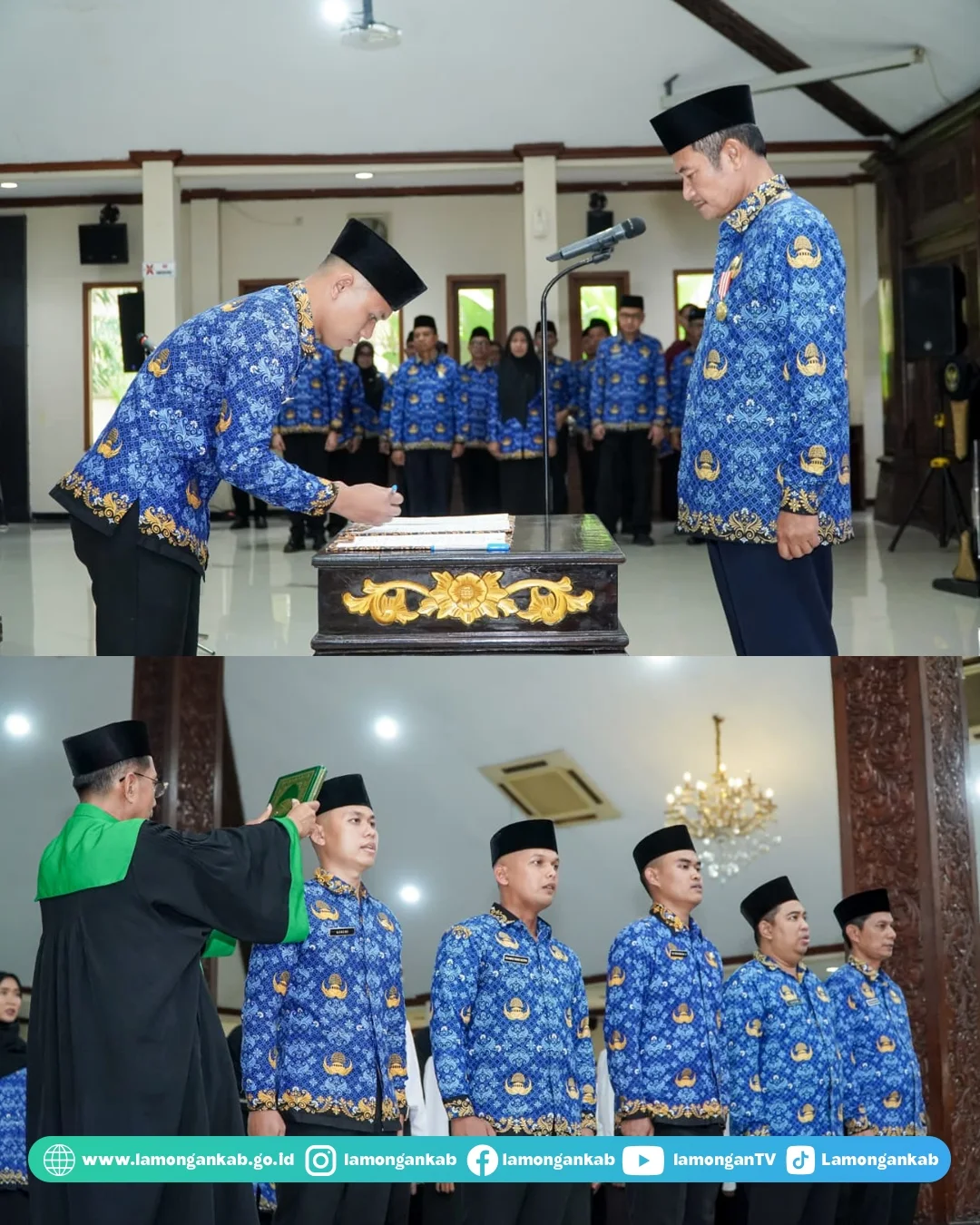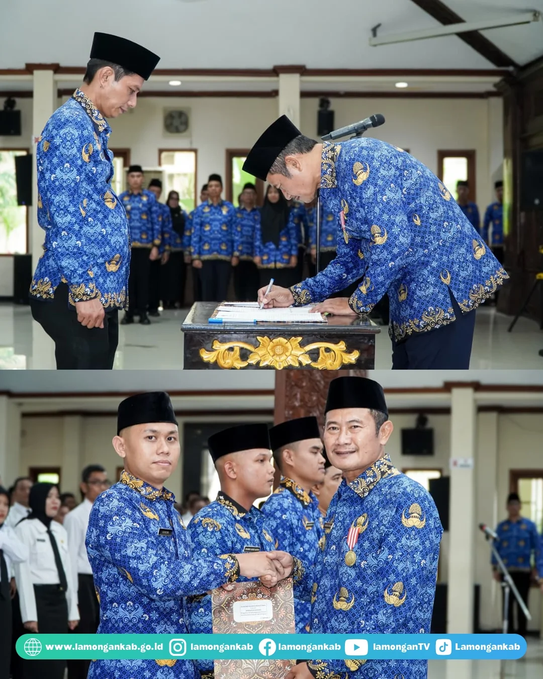 "Saat ini Pemerintah Kabupaten Lamongan sedang melaksanakan reformasi birokrasi, yangmana seluruh kegiatan dan keputusan yang dibuat mampu memberikan dampak nyata bagi masyarakat. Untuk mewujudkan hal tersebut, ASN harus menjadi motor penggerak realisasinya dengan profesionalisme yang dimiliki," tutur Bupati Lamongan Yuhronur Efendi saat melakukan pelantikan dan pengambilan sumpah janji 91 Pegawai Negeri Sipil (PNS) dalam jabatan fungsional dan menyerahkan surat keputusan ke 231 Pegawai Pemerintah dengan Perjanjian Kerja (PPK) paruh waktu di lingkungan Pemerintah Kabupaten Lamongan, Senin (1/12/2025) di Pendopo Lokatantra.