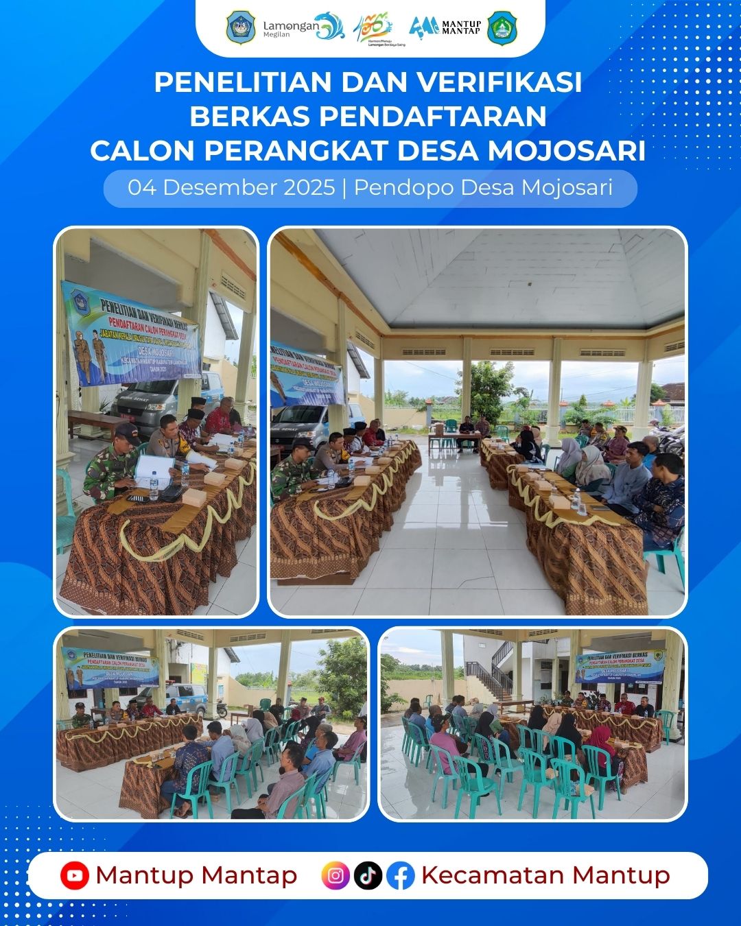 Tahapan penjaringan dan penyaringan Calon Perangkat Desa Mojosari Tahun 2025 terus berjalan sesuai ketentuan perundang-undangan. Pada hari ini Kamis (4/12), Panitia Pengisian Perangkat Desa bersama Tim Pengawas Kecamatan Mantup melaksanakan kegiatan Penelitian dan Verifikasi Berkas Administrasi Pendaftaran Calon Perangkat Desa Mojosari, bertempat di Pendopo Desa Mojosari.