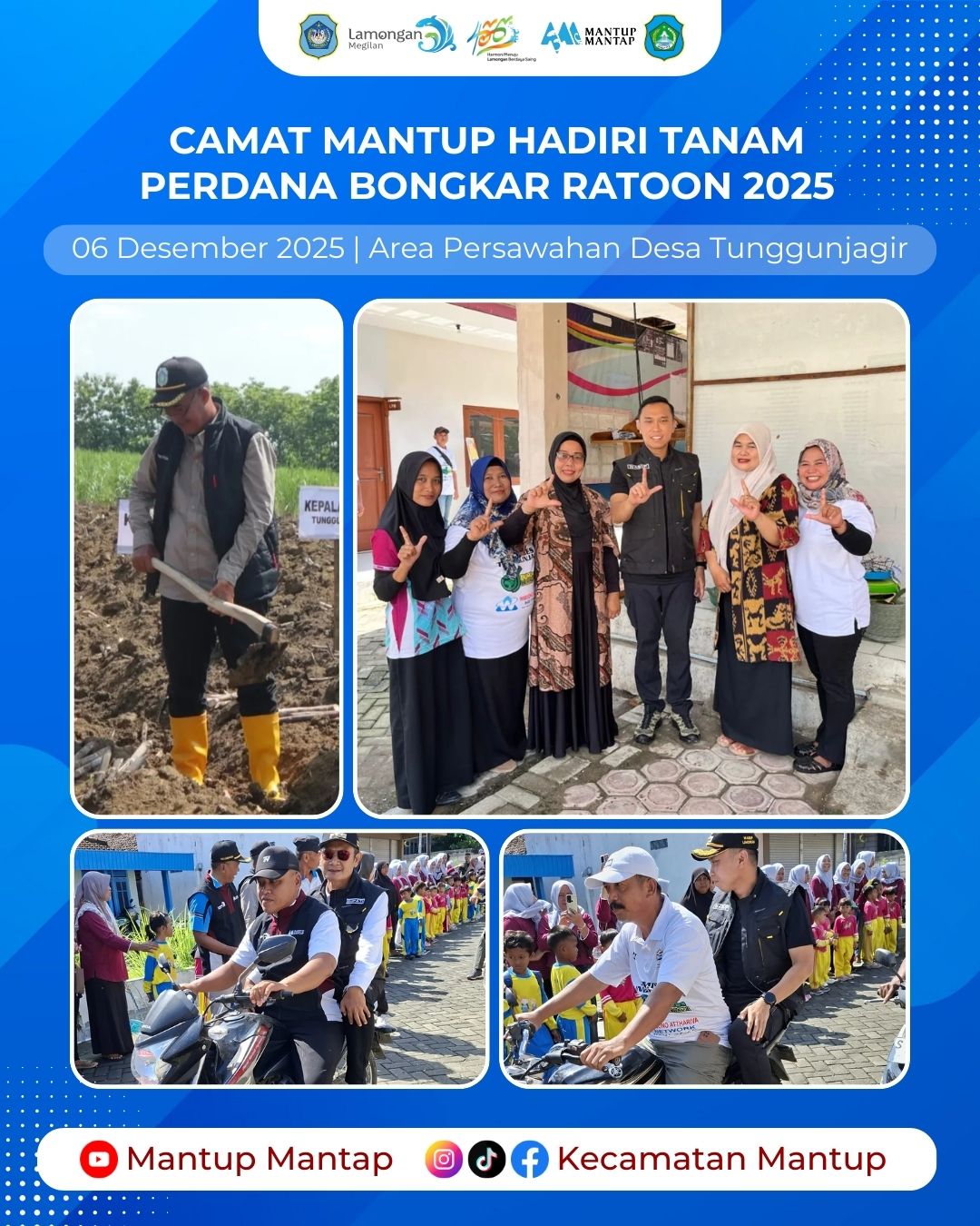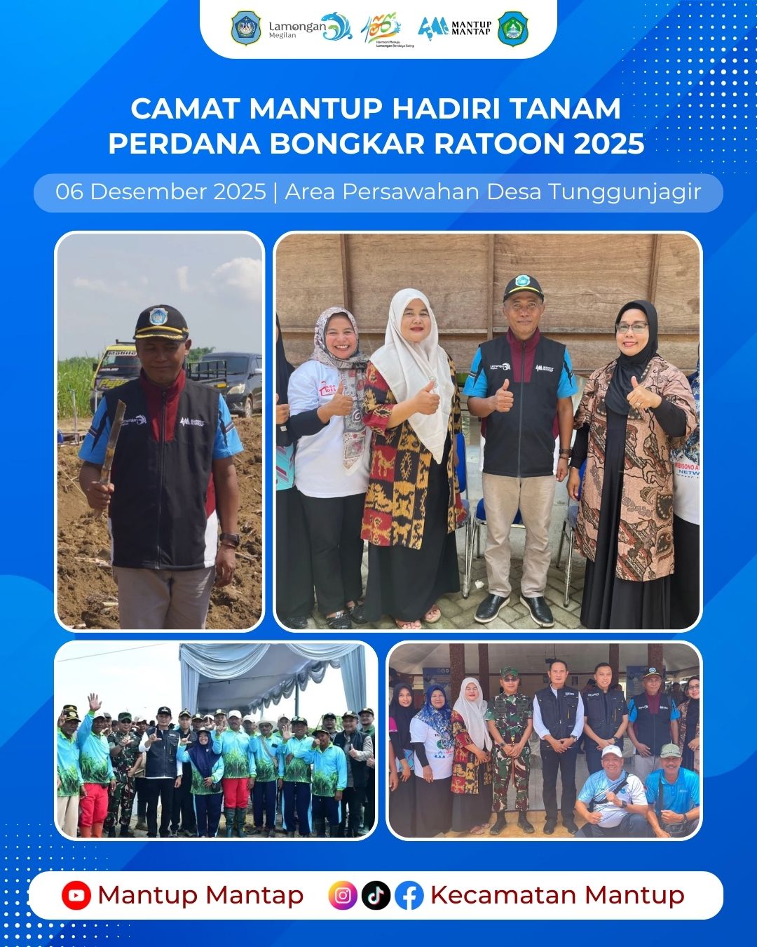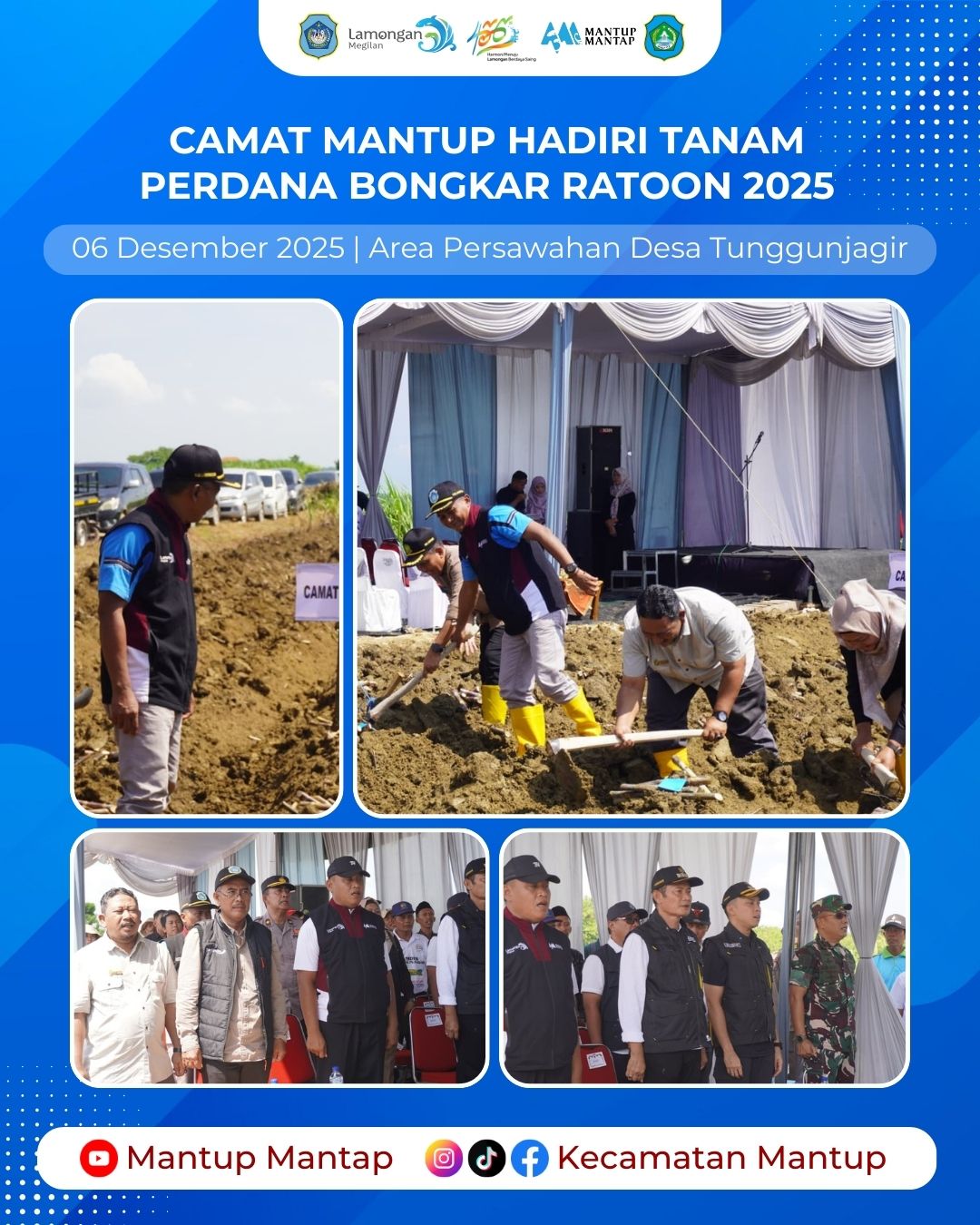 Camat Mantup menghadiri kegiatan Tanam Perdana Bongkar Ratoon Tahun 2025 yang berlangsung pada Sabtu (6/12) di area perkebunan tebu Desa Tunggunjagir, Kecamatan Mantup. Kegiatan ini turut dihadiri oleh Bupati Lamongan Yuhronur Efendi dan Wakil Bupati Dirham Akbar Aksara bersama jajaran Forkopimda juga PT SGN (Sinergi Gula Nusantara) serta unsur Forkopimcam Mantup, Kelompok Tani, dan perangkat desa setempat.