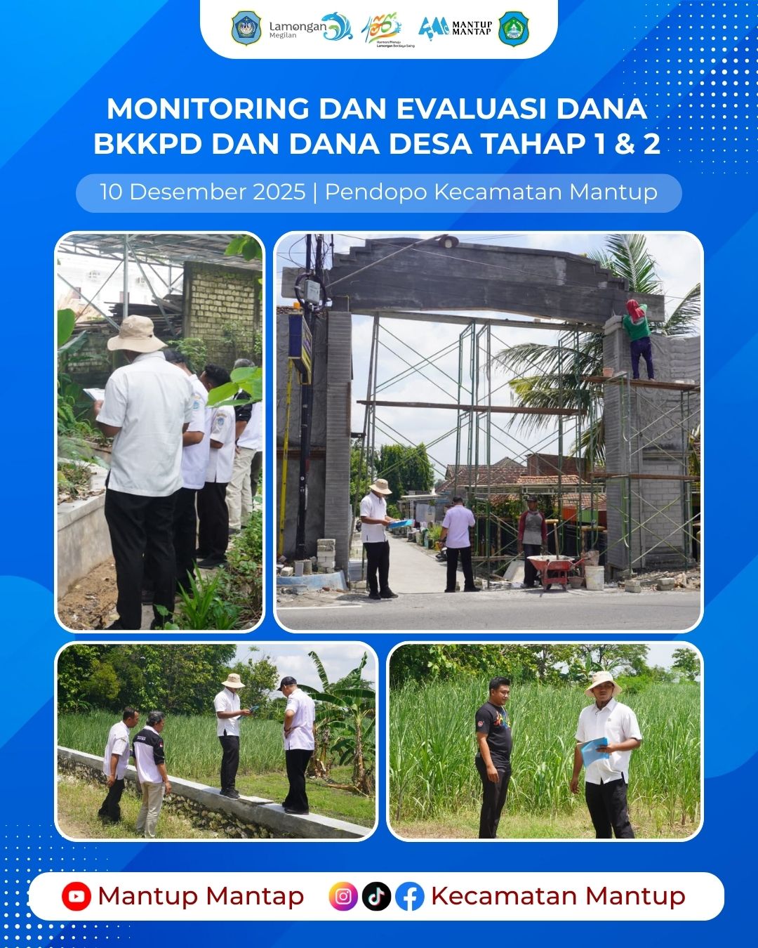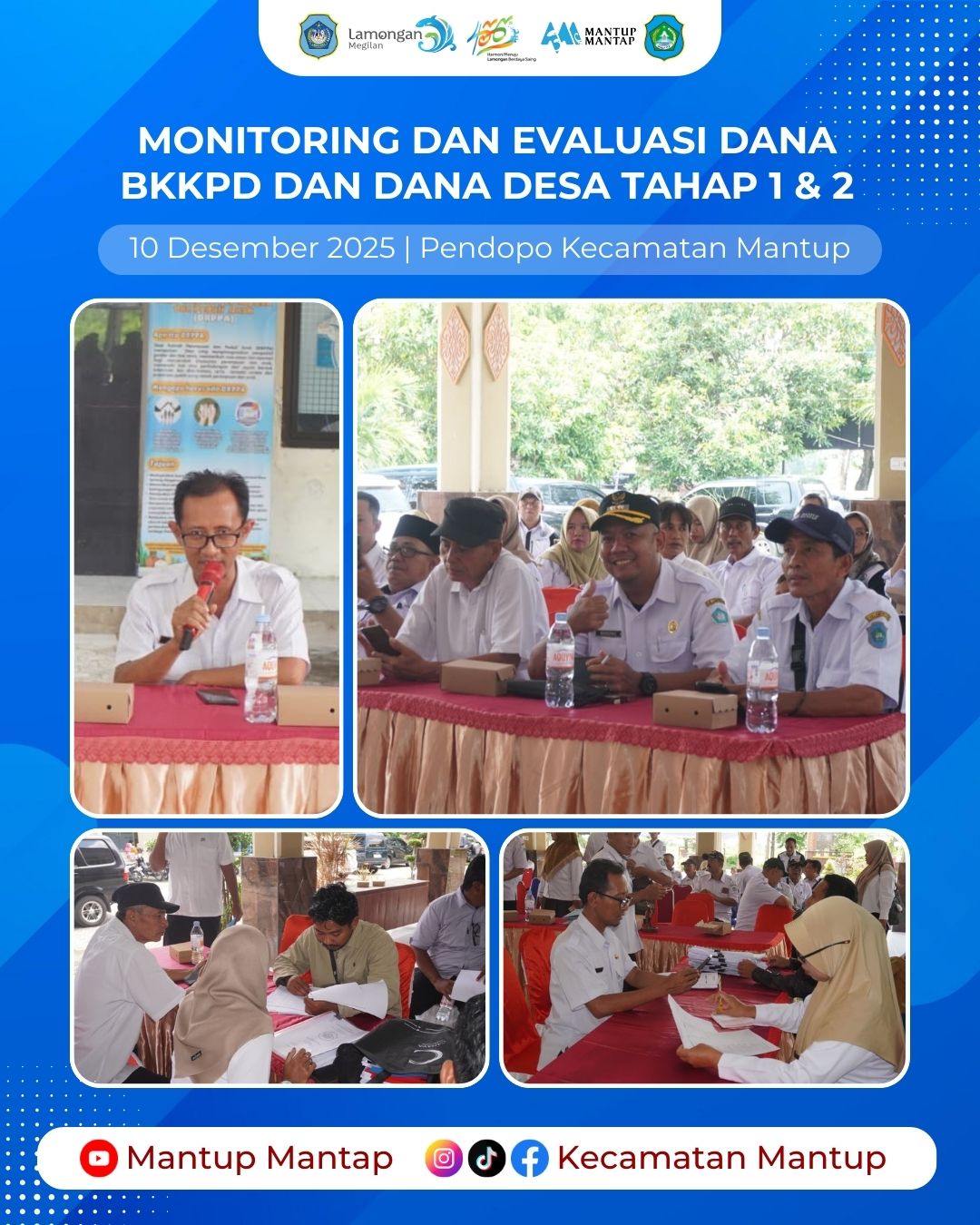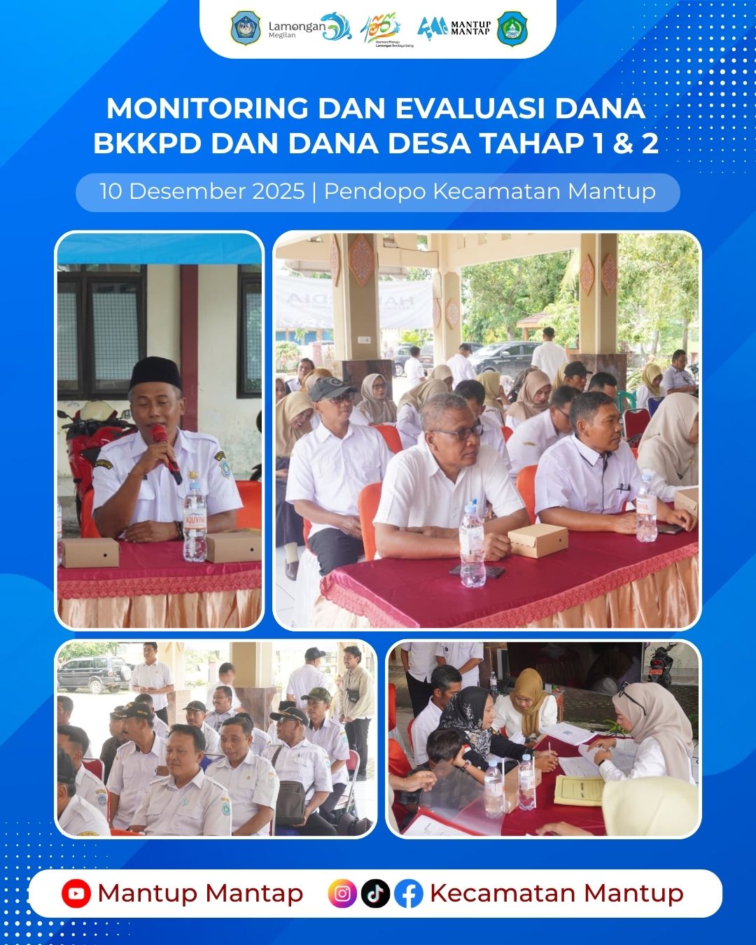 Pemerintah Kecamatan Mantup bersama Dinas Pemberdayaan Masyarakat dan Desa Kabupaten Lamongan melaksanakan kegiatan Monitoring dan Evaluasi (Monev) atas pelaksanaan Dana BKKPD serta Dana Desa Tahap 1 dan Tahap 2 pada Rabu (10/12) di Pendopo Kecamatan Mantup. Kegiatan ini bertujuan memastikan tata kelola anggaran desa berjalan sesuai ketentuan dan memberikan manfaat maksimal bagi masyarakat.