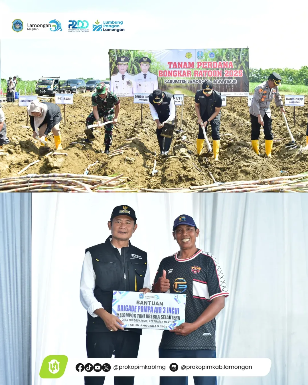 Mendukung pelaksanaan program strategis Kementerian Pertanian terkait swasembada gula, Bupati Lamongan Yuhronur Efendi dan Wakil Bupati Dirham Akbar Aksara bersama jajaran Forkopimda juga PT SGN (Sinergi Gula Nusantara), pada Sabtu (6/12) melaksanakan kegiatan Tanam Perdana Bongkar Ratoon di Desa Tunggunjagir Kecamatan Mantup. Kegiatan ini dimaksudkan untuk meremajakan tanaman tebu tua dengan bibit baru guna meningkatkan produktivitas dan mencapai swasembada gula nasional.