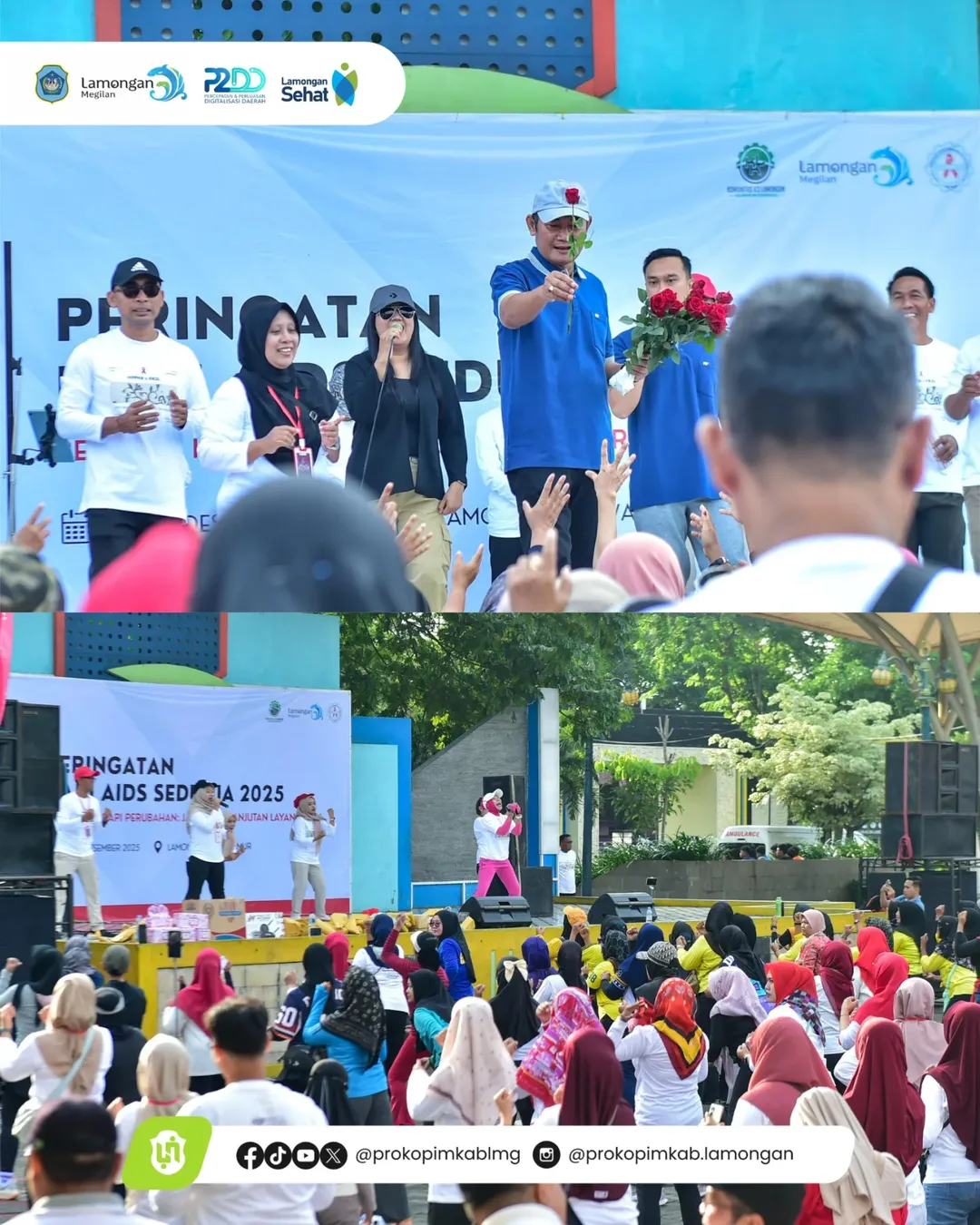 Senam Pekerja Sehat yang diikuti ratusan masyarakat mewarnai peringatan Hari AIDS Sedunia tahun 2025 yang diadakan di Alun-Alun Lamongan pada Minggu (7/12). Dihadiri Bupati Lamongan, Yuhronur Efendi, acara ini juga menyediakan layanan pemeriksaan kesehatan dan konsultasi HIV/AIDS secara gratis. Dalam sambutannya, Pak Yes mengajak seluruh masyarakat untuk peduli dan ikut berpartisipasi dalam upaya pencegahan serta penanggulangan AIDS.