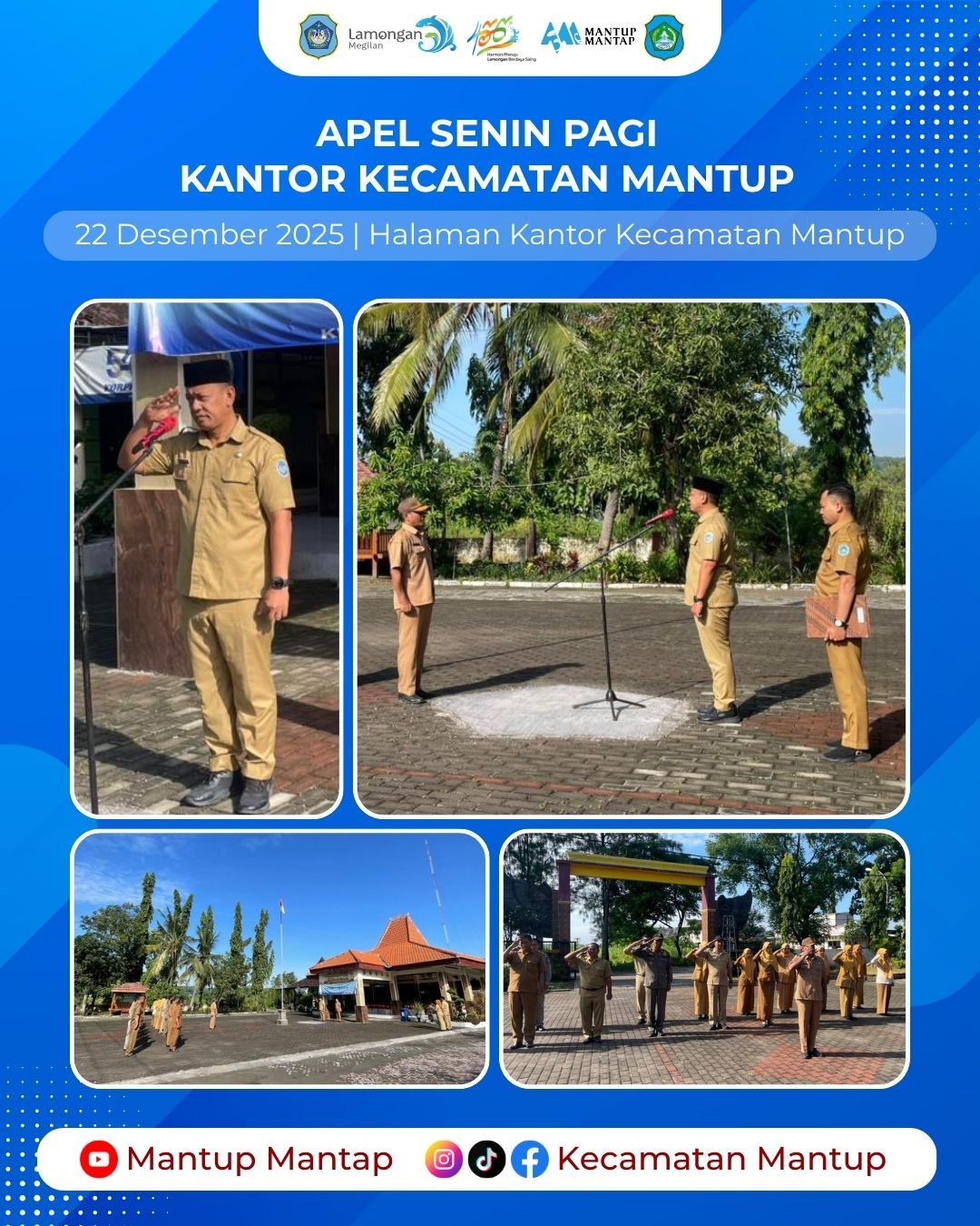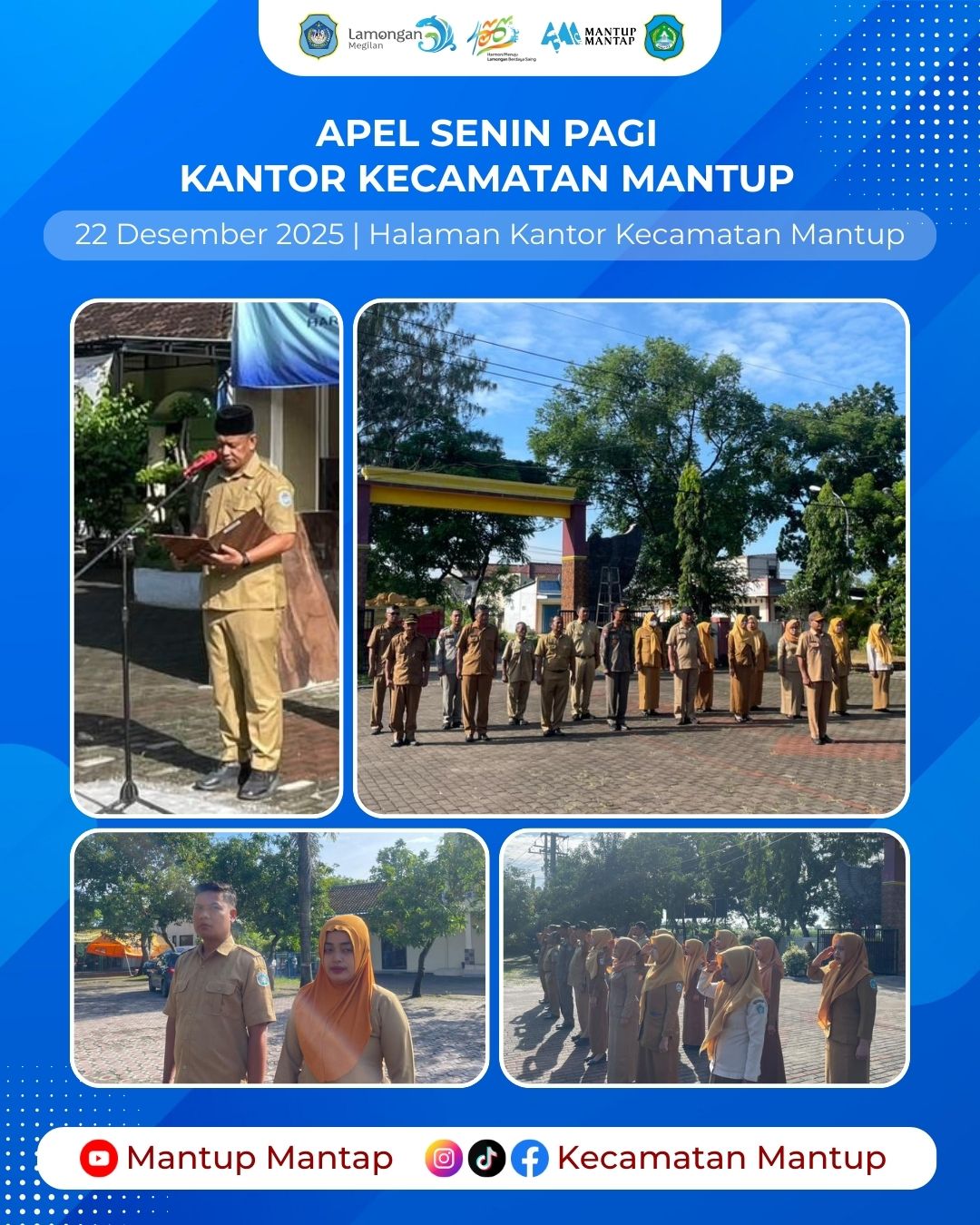 Pemerintah Kecamatan Mantup melaksanakan Apel Senin Pagi yang bertempat di halaman Kantor Kecamatan Mantup dan diikuti oleh seluruh Aparatur Sipil Negara (ASN) serta Koordinator PPKB. Apel rutin ini dilaksanakan sebagai sarana pembinaan disiplin, peningkatan kinerja, serta penguatan koordinasi internal di lingkungan Pemerintah Kecamatan Mantup.