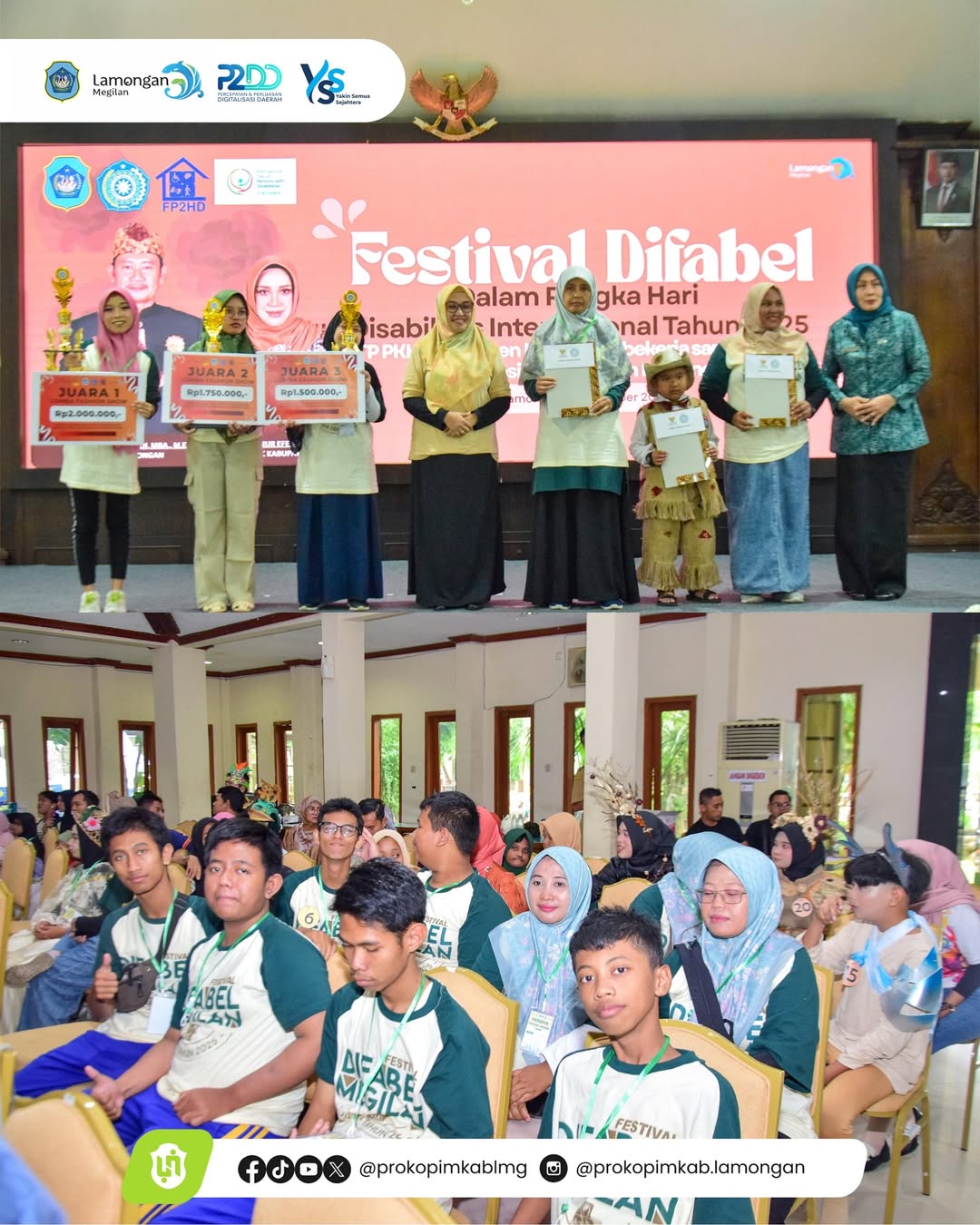 Dalam rangka memperingati Hari Disabilitas Internasional Tahun 2025, Bupati Lamongan, Yuhronur Efendi, membuka secara langsung Festival Difabel sekaligus melantik pengurus Forum Perlindungan dan Pemenuhan Hak Disabilitas (FP2HD) Kabupaten Lamongan, di Pendopo Lokatantra, Selasa (9/12). Pada kesempatan tersebut, Pak Yes memberikan semangat kepada penyandang disabilitas, untuk tidak memandang ketidaksempurnaan sebagai kekurangan, melainkan menjadi motivasi dalam menghasilkan sebuah karya yang akan menginspirasi dan bermanfaat bagi seluruh masyarakat.
