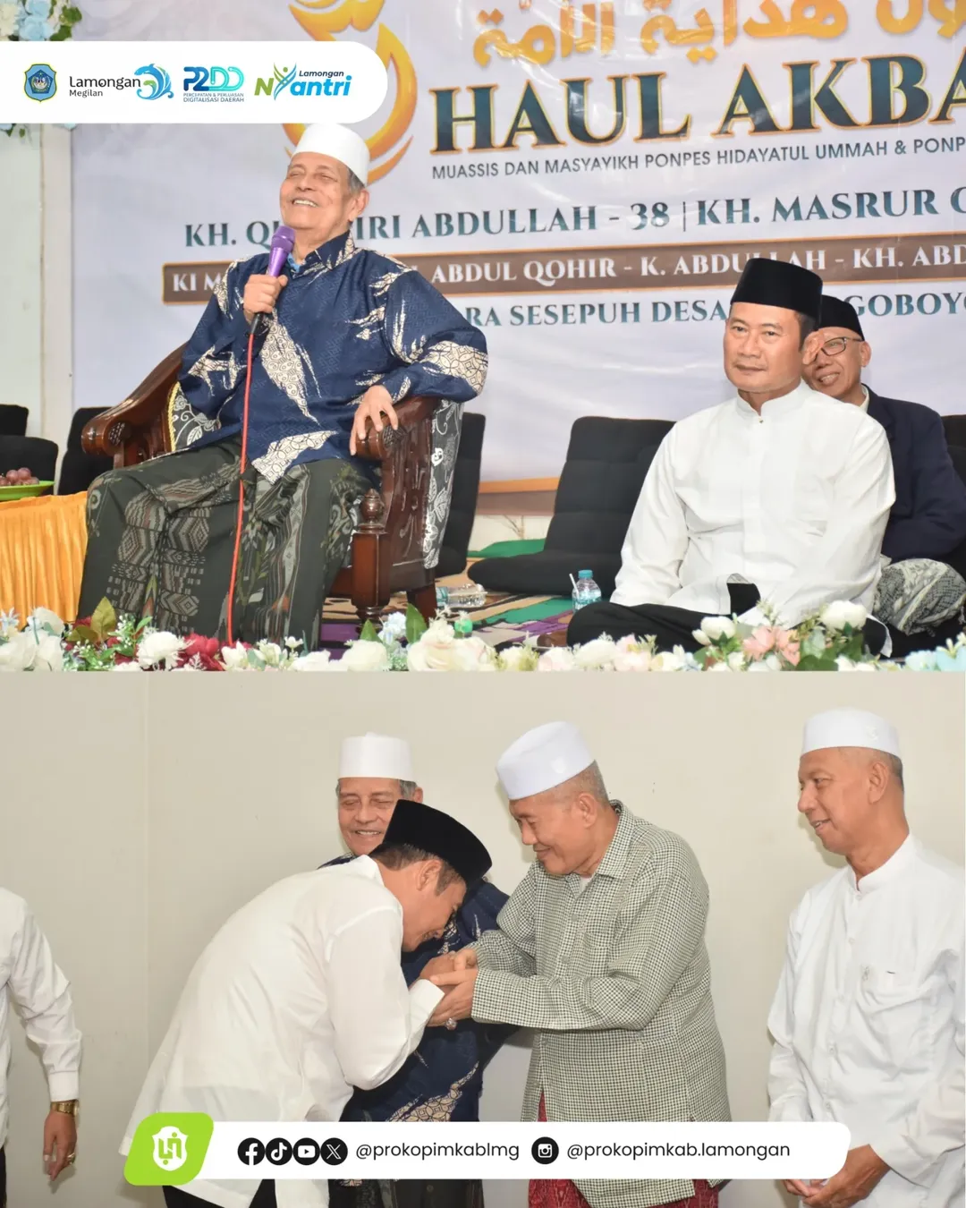 Bupati Lamongan Yuhronur Efendi menghadiri Haul Akbar Muassis dan Masyayikh Pondok Pesantren Hidayatul Ummah Pringgoboyo serta Ponpes Langitan, Kamis (11/12) di Desa Pringgoboyo, Maduran. Pada kesempatan ini, Bupati YES menyampaikan kemajuan pembangunan Kabupaten Lamongan, yang didukung pelaksanaan program prioritas Pemkab Lamongan maupun program Pemerintah Pusat.