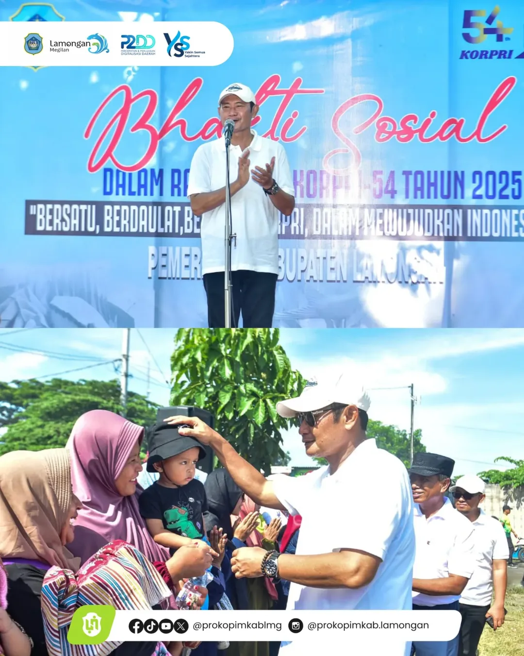 Bupati Lamongan Yuhronur Efendi menyerahkan bantuan kepada 100 keluarga kurang mampu dan serta ibu hamil dan ibu menyusui pada acara Bakti Sosial dalam rangka HUT ke-54 Korpri, Jumat (12/12), di Telaga Bandung Kelurahan Sukomulyo dan Kolam Retensi Kelurahan Sidokumpul. Bantuan ini sebagai bentuk pengabdian Korpri dalam meningkatkan kesejahteraan masyarakat.