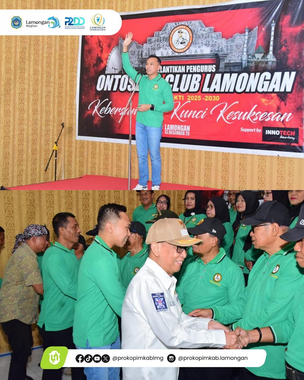 Mewakili Bupati Lamongan, Dirham Akbar Aksar (Wabup) menghadiri acara pelantikan Pengurus Ontoseno Club Lamongan periode 2025–2030 yang digelar di Jl. Sunan Kalijaga No.27 Lamongan pada Sabtu (13/12). Wabup Dirham menyampaikan ucapan selamat dan sukses kepada seluruh pengurus Ontoseno Club Lamongan yang baru saja dilantik. Ia berharap kepengurusan baru mampu membawa Ontoseno menjadi komunitas yang semakin solid, maju, serta memberikan nilai manfaat nyata bagi masyarakat Lamongan.