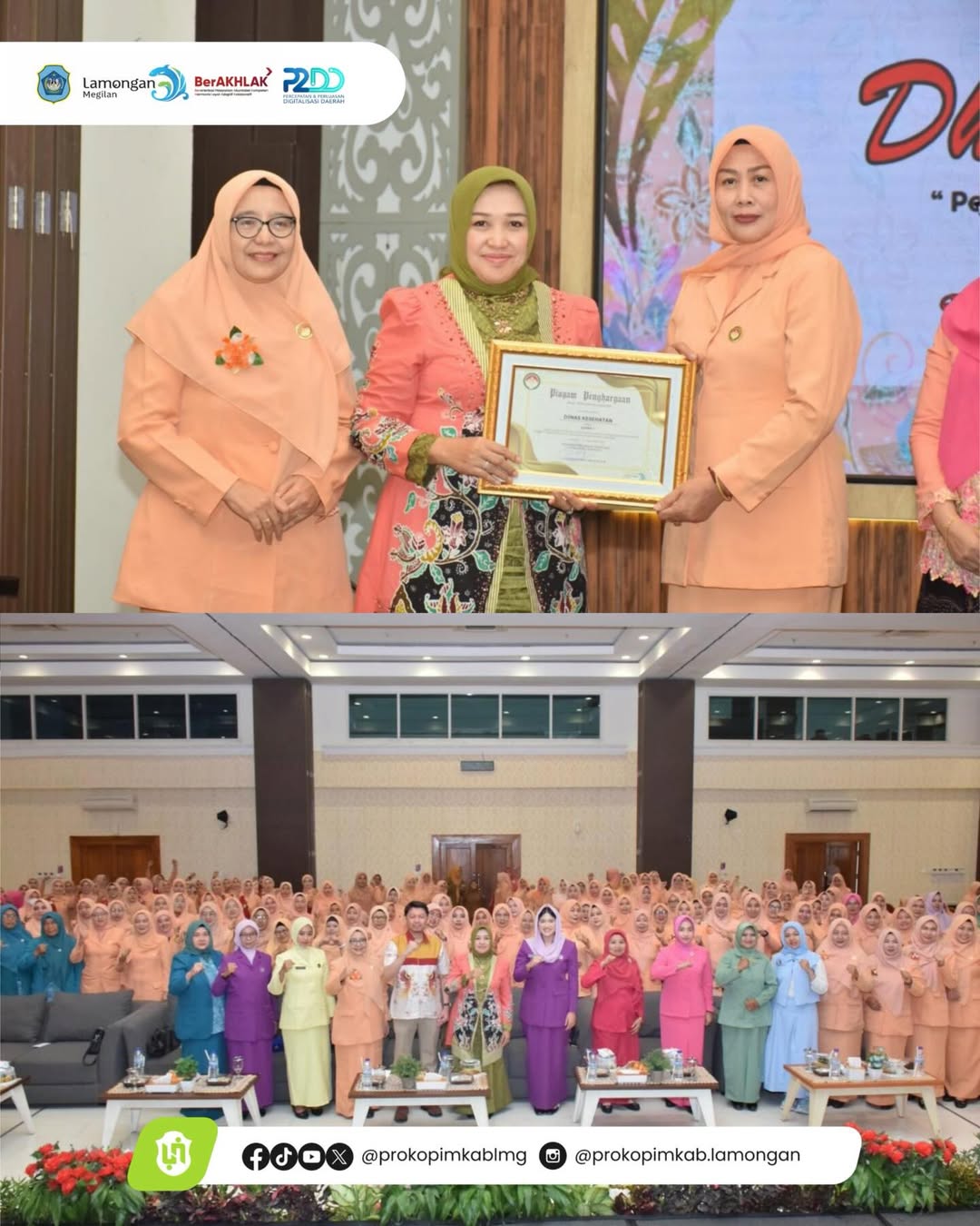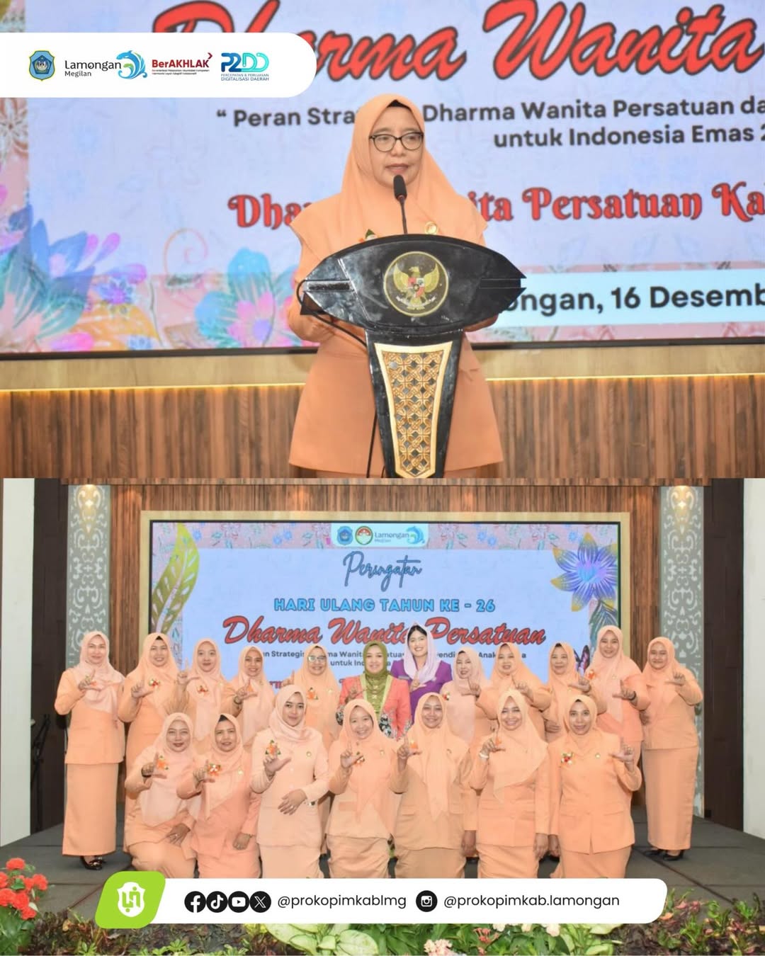 Puncak Peringatan HUT ke-26 Dharma Wanita Persatuan (DWP) Kabupaten Lamongan dilaksanakan pada Selasa (16/12) di Aula Gajah Mada Lantai 7 Pemerintah Kabupaten Lamongan. Mengusung tema “Peran Strategis Dharma Wanita Persatuan dalam Pendidikan Anak Bangsa untuk Indonesia Emas 2045, Penasehat DWP Kabupaten Lamongan, Ibu Anis Yuhronur Efendi, menegaskan pentingnya peran perempuan, khususnya istri Aparatur Sipil Negara (ASN), dalam mendukung pembangunan daerah melalui penguatan peran keluarga serta pendidikan anak sebagai fondasi generasi masa depan.