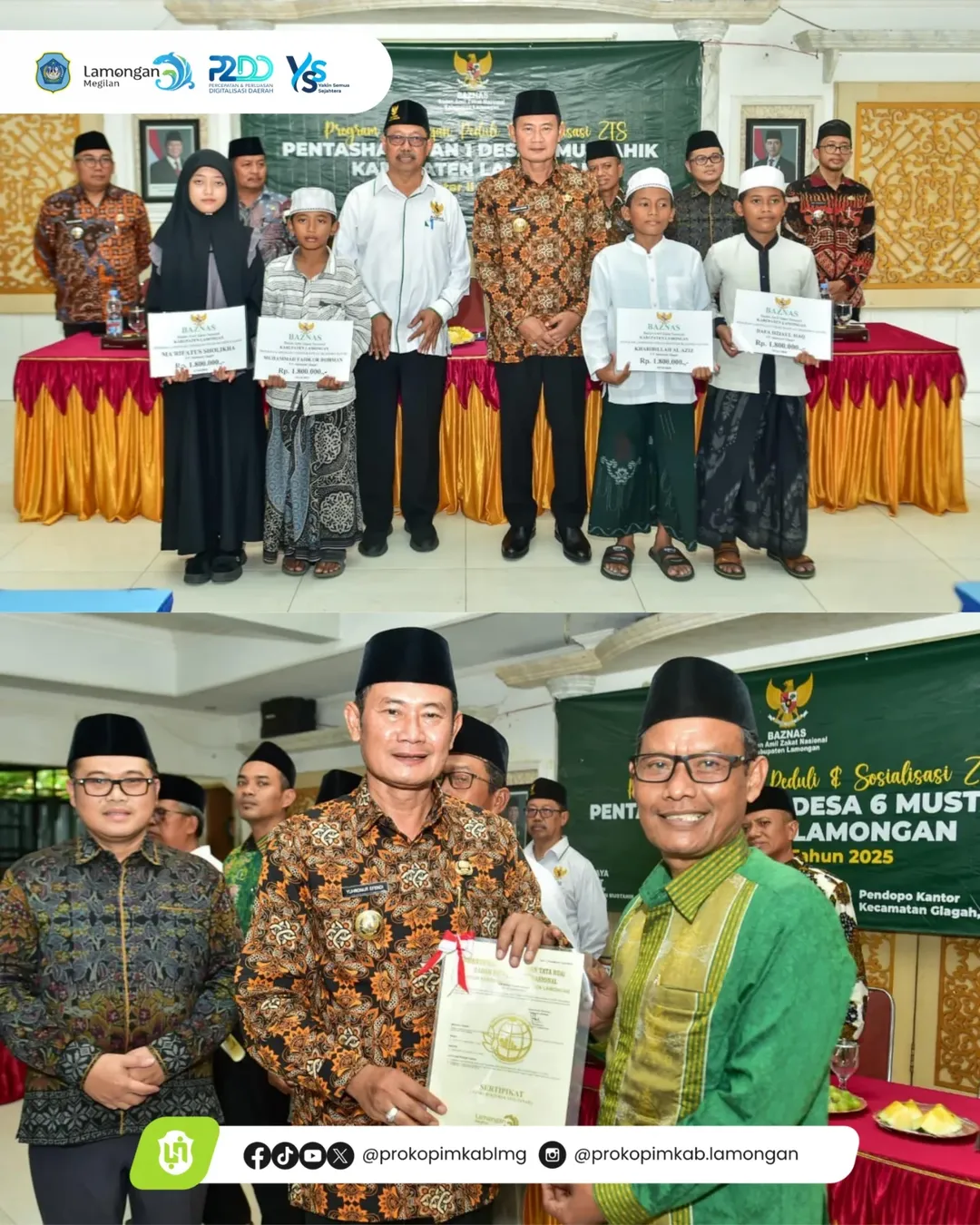 Bertempat di Balai Desa Glagah, Kamis (18/12), Bupati Lamongan, Yuhronur Efendi hadir secara langsung melakukan Pentasyarufan Baznas kepada 300 mustahik dari 29 desa se-Kecamatan Glagah dan 21 desa se-Kecamatan Karangbinangun. Dalam kesempatan tersebut, Pak Yes juga menyerahkan beasiswa santri kepada 6 santri dan 5 sertipikat wakaf masjid.