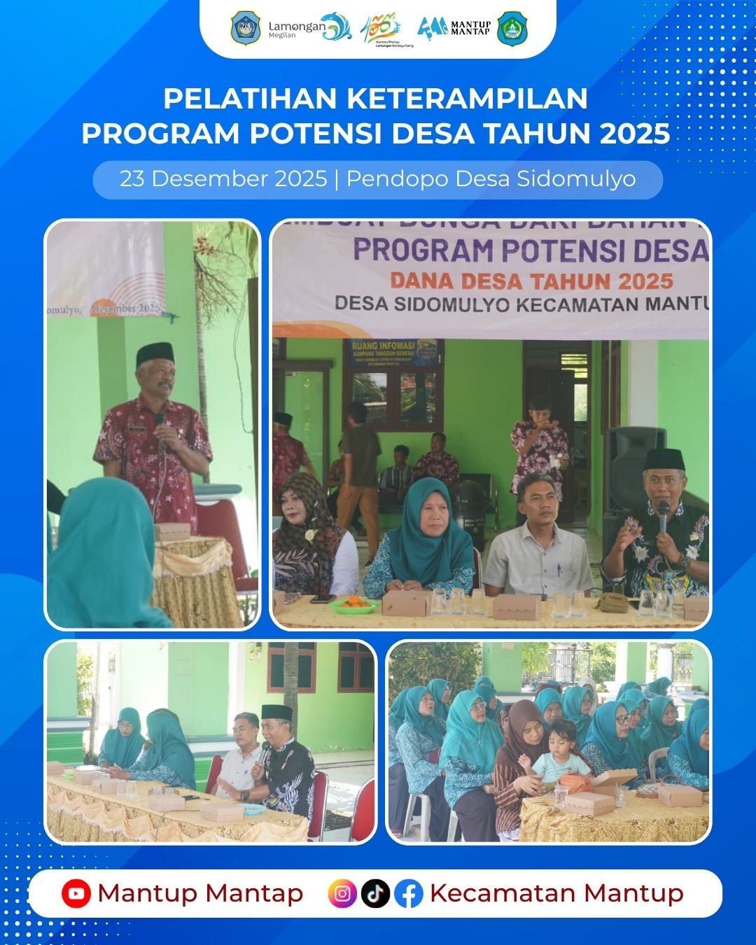 Pemerintah Desa Sidomulyo, Kecamatan Mantup, menyelenggarakan Pelatihan Keterampilan Pembuatan Bunga dari Bahan Klobot (Kulit Jagung) sebagai bagian dari Program Pemberdayaan Masyarakat yang bersumber dari Dana Desa Tahun Anggaran 2025 pada Selasa, (23/12) bertempat di Pendopo Desa Sidomulyo, Kecamatan Mantup. Kegiatan ini bertujuan untuk meningkatkan keterampilan masyarakat dalam memanfaatkan limbah pertanian menjadi produk kerajinan bernilai jual.