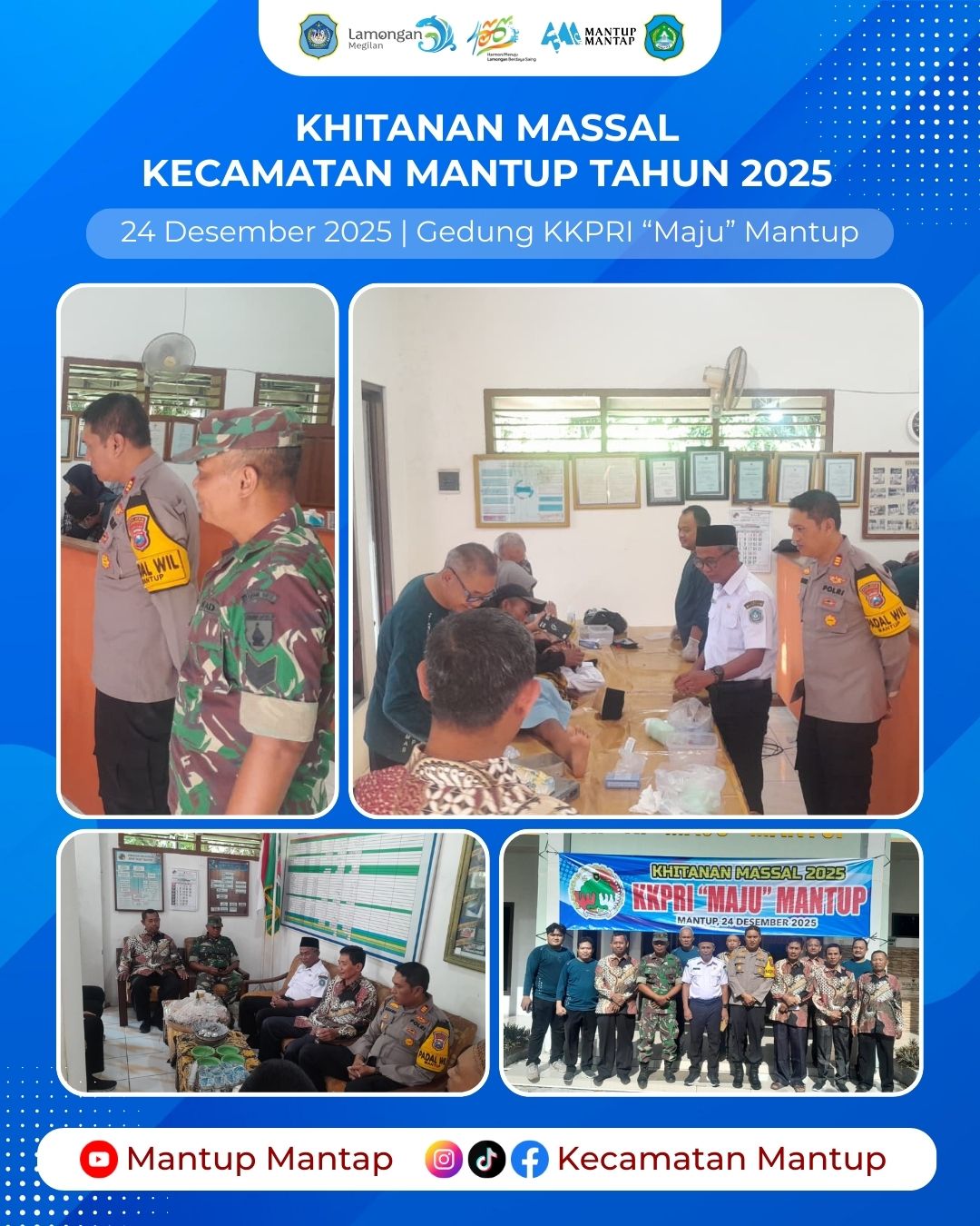 Pemerintah Kecamatan Mantup menyelenggarakan Khitanan Massal Tahun 2025 pada Rabu, (24/12) bertempat di Gedung KKPRI “Maju” Mantup. Kegiatan sosial ini diikuti oleh sejumlah anak dari berbagai desa di wilayah Kecamatan Mantup, dengan tujuan membantu meringankan beban keluarga kurang mampu sekaligus meningkatkan derajat kesehatan masyarakat.