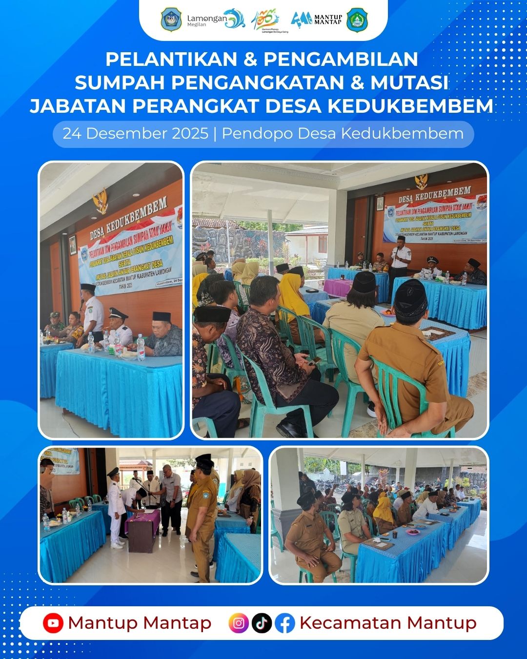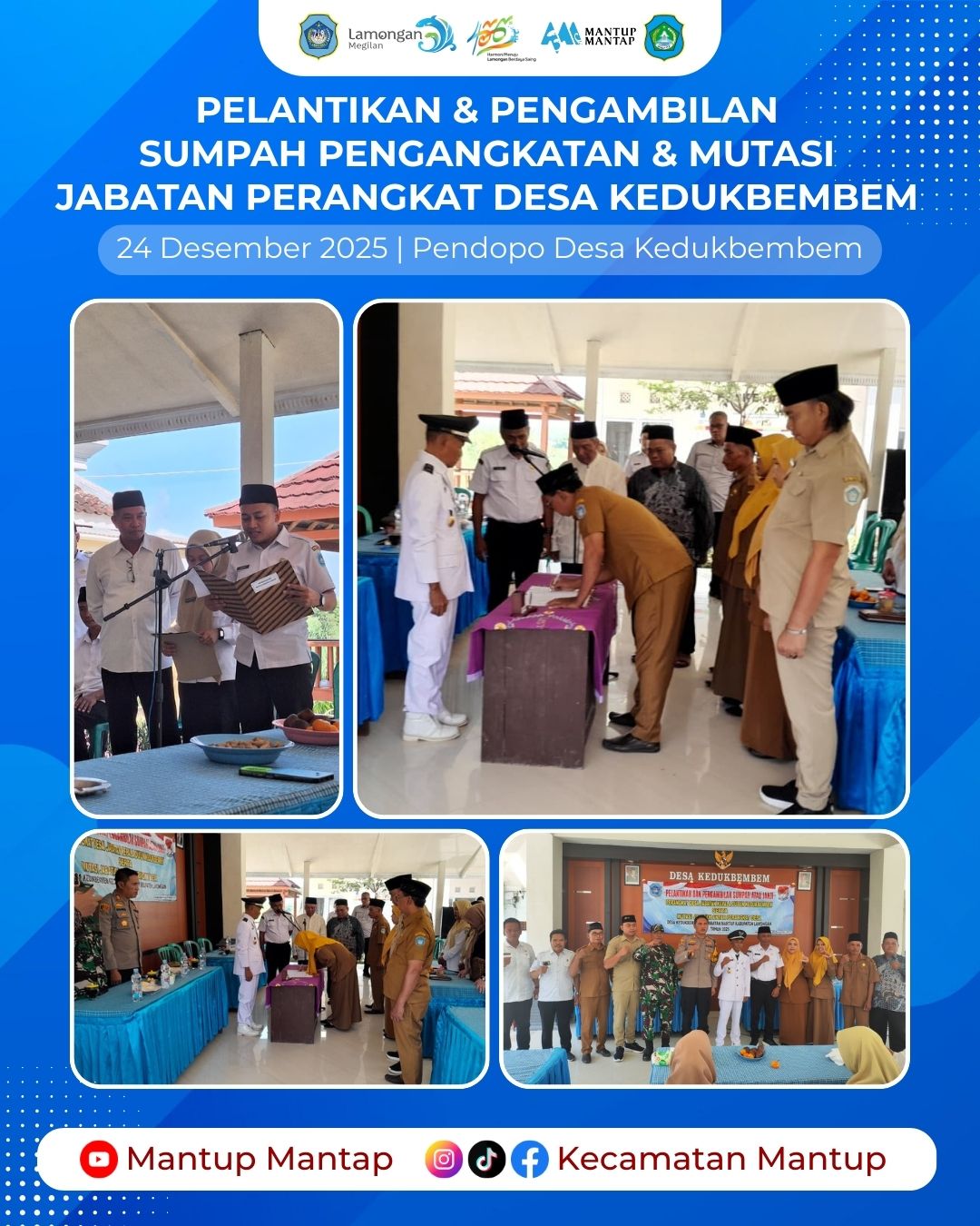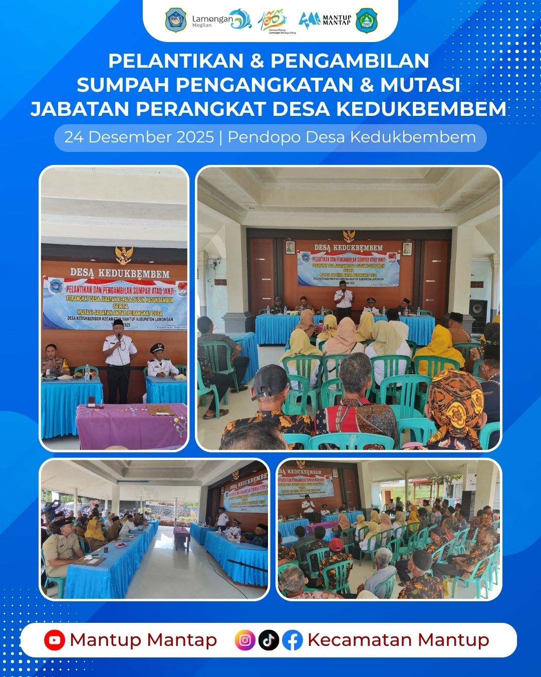 Pemerintah Desa Kedukbembem, Kecamatan Mantup, menyelenggarakan Pelantikan dan Pengambilan Sumpah Pengangkatan serta Mutasi Jabatan Perangkat Desa yang bertempat di Pendopo Desa Kedukbembem, Rabu (24/12). Kegiatan ini dilaksanakan sebagai tindak lanjut dari proses pengisian, penataan, dan penyesuaian kebutuhan organisasi pemerintahan desa sesuai dengan ketentuan peraturan perundang-undangan.
