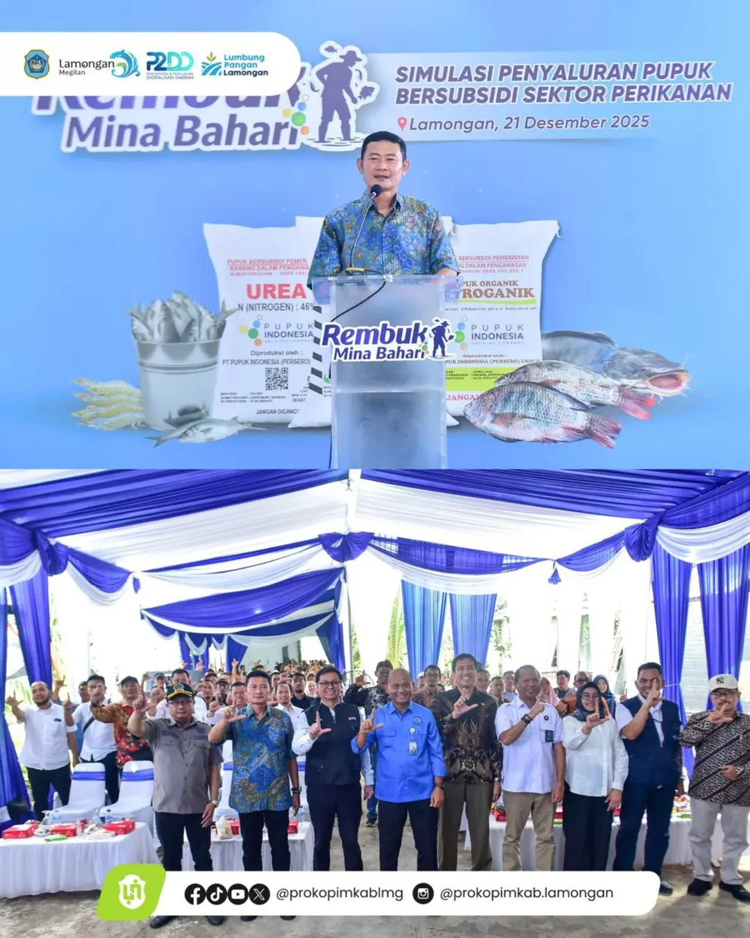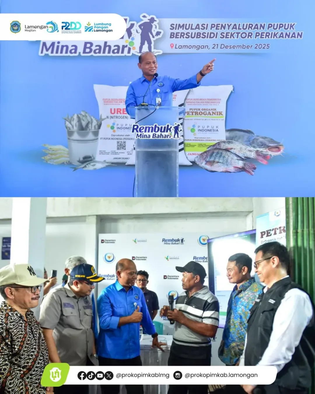 Menyambut kembalinya pupuk bersubsidi untuk sektor perikanan yang rencananya diberlakukan mulai Januari 2026, Kabupaten Lamongan terpilih sebagai tempat pertama pelaksanaan simulasi dan sosialisasi penyaluran pupuk pada Minggu (21/12) di Desa Sukorejo, Kecamatan Turi. Kegiatan tersebut dihadiri langsung oleh Dirjen Perikanan Budidaya Tb. Haeru Rahayu didampingi Bupati Lamongan Yuhronur Efendi dan Ketua DPRD Lamongan M. Freddy Wahyudi.