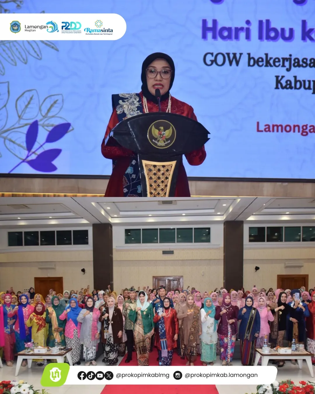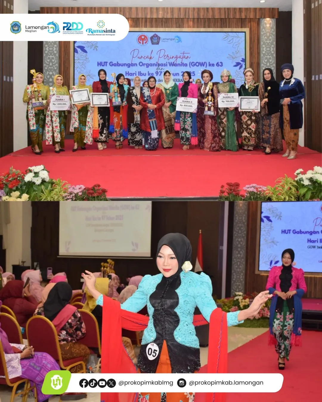 Dalam rangka memperingati Hari Ibu ke-97, Gabungan Organisasi Wanita (GOW) Kabupaten Lamongan dan Dewan Kerajinan Nasional Daerah (Dekranasda) Kabupaten Lamongan menggelar Lomba Fashion Show di Aula Gajah Mada Gedung Pemda Lamongan, Selasa (23/12). Pada sambutannya, Ketua Dekranasda Lamongan, Anis Yes, mengapresiasi peran perempuan dan mendukung karya-karya mereka, sesuai dengan tujuan lomba yang mewajibkan peserta mengenakan kebaya yang dipadukan dengan wastra khas Lamongan.