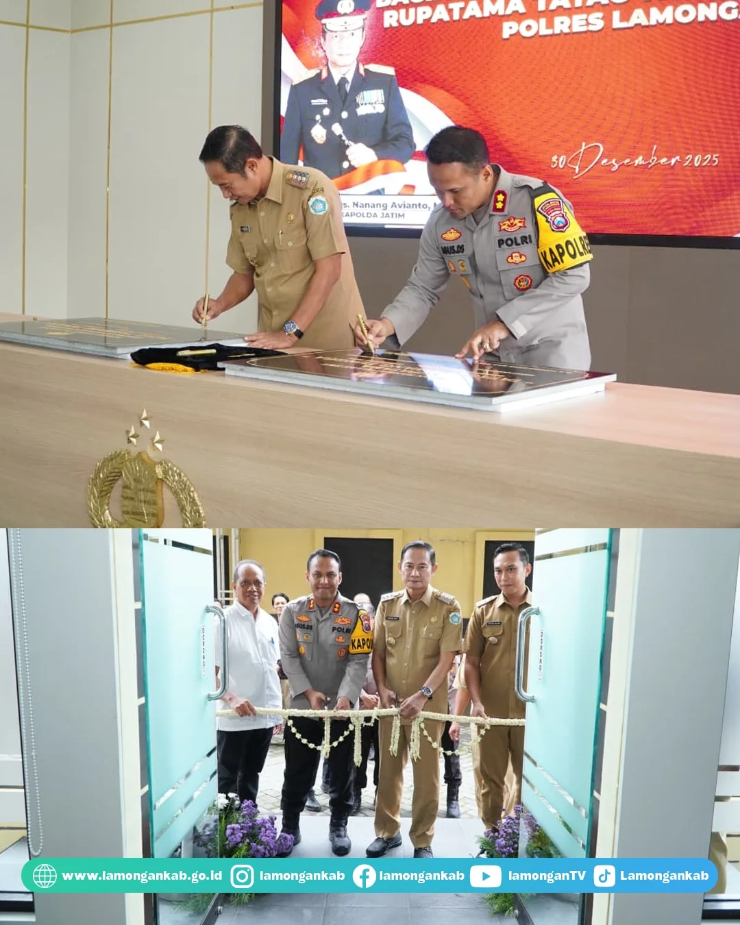 Bupati Lamongan Yuhronur Efendi bersama Kapolres Lamongan Agus Dwi Suryanti meresmikan dua gedung Polres Lamongan, yangmana merupakan hibah dari APBD Pemkab Lamongan tahun 2025, Selasa (30/12) di gedung Tatag Trawang Tungga dan gedung Rupatama Tatag Trawang Tungga.