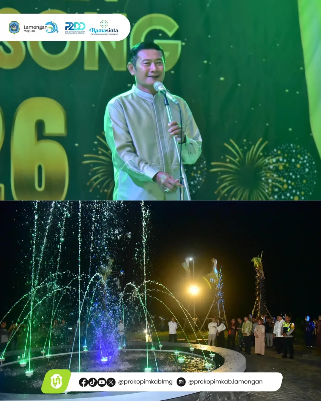 Bupati Lamongan, Pak YES, meresmikan air mancur di kawasan Gajah Mada bersama jajaran Forum Koordinasi Pimpinan Daerah (Forkopimda) pada malam pergantian Tahun Baru 2025 menuju 2026, Rabu (31/12). Peresmian tersebut menjadi bagian dari rangkaian perayaan tahun baru sekaligus penanda pengembangan lanjutan Kawasan Gajah Mada sebagai ruang publik kota.