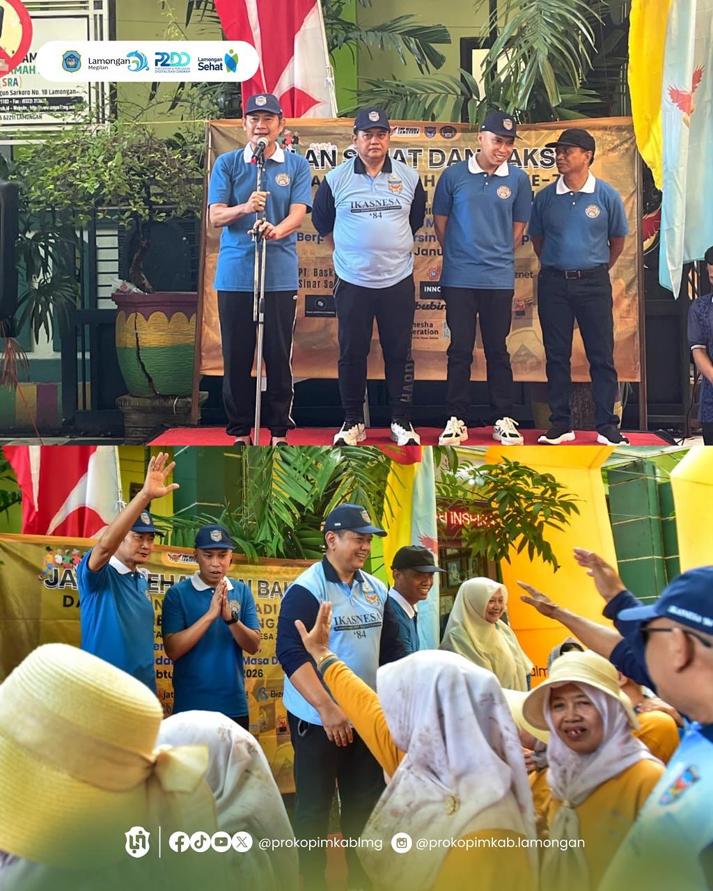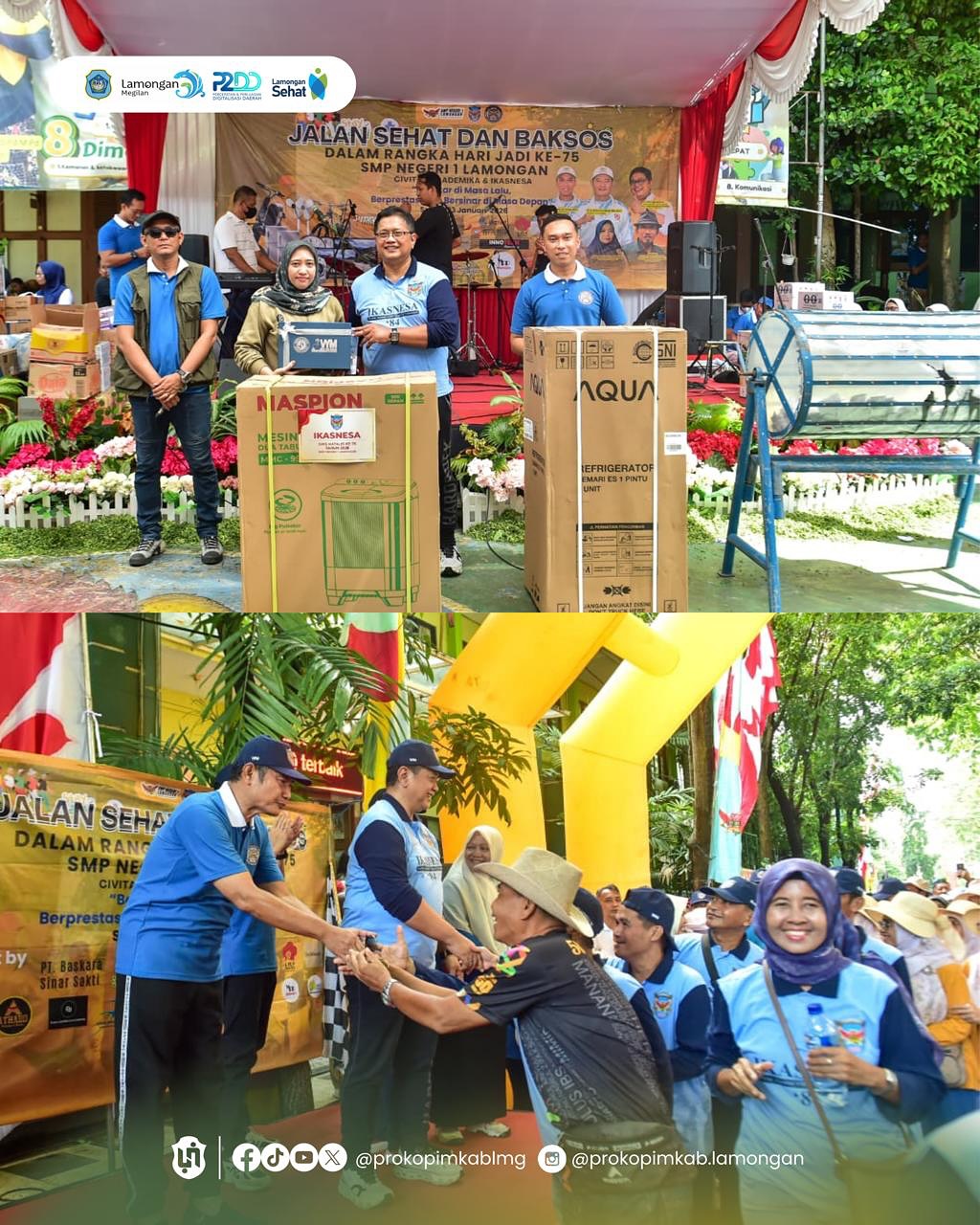 Bupati Lamongan, Yuhronur Efendi, bersama Wakil Menteri Transmigrasi RI, Viva Yoga Mauladi, yang juga Ketua Ikatan Alumni SMPN 1 Lamongan (Ikasnesa) memberangkatkan secara langsung jalan sehat dalam rangka Dies Natalis ke-75 SMP Negeri 1 Lamongan, Sabtu (3/1). Dalam kesempatan tersebut, Pak Yes menyampaikan harapannya agar SMPN 1 Lamongan bisa terus menorehkan prestasi serta menghasilkan bibit-bibit unggul yang kelak bermanfaat bagi masa depan bangsa.
