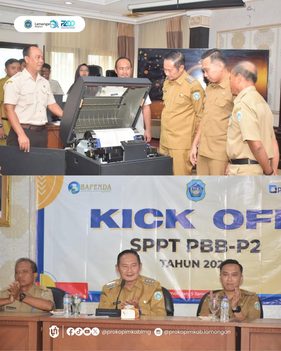 Bupati Lamongan Yuhronur Efendi didampingi Wabup Dirham secara langsung melaksanakan Kick Off (me-launching) Cetak SPPT PBB-P2 Tahun 2026 yang digelar, Senin (5/1) di Ruang Sasana Nayaka, Kantor BPKAD Kabupaten Lamongan. Dalam sambutannya, Bupati Yes menegaskan pentingnya PBB-P2 sebagai instrumen strategis dalam memperkuat kemandirian fiskal daerah. Beliau menyampaikan bahwa optimalisasi PBB menjadi langkah paling nyata dan cepat yang dapat dilakukan pemerintah daerah dalam mendukung pembangunan daerah.