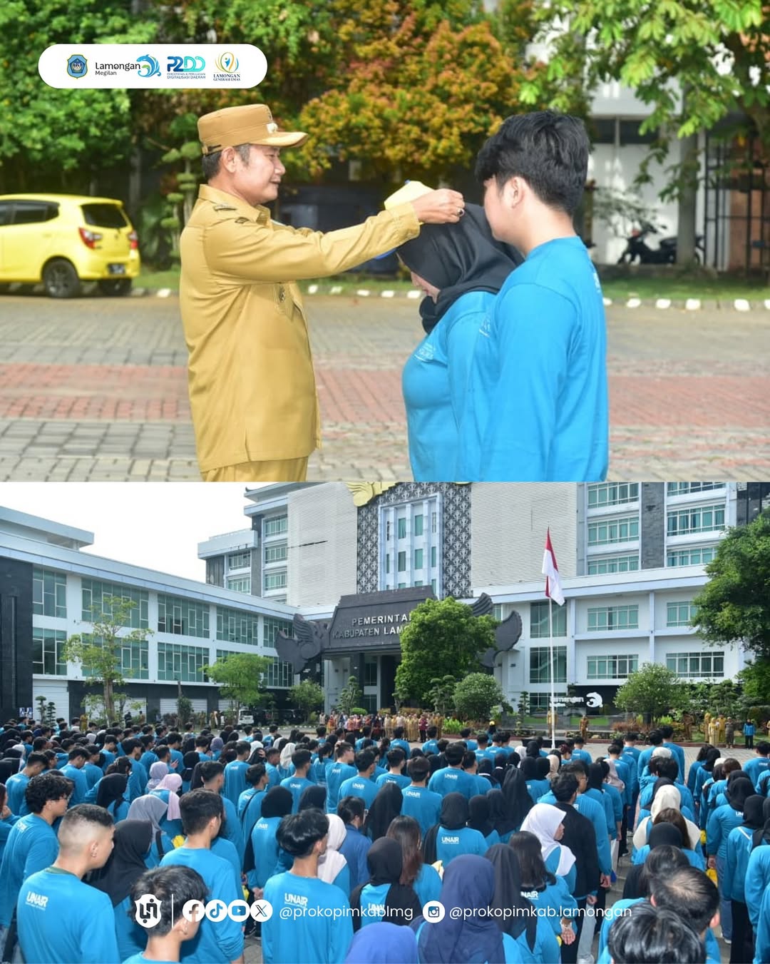 Di Halaman Pemkab Lamongan, Bupati Yes menerima 713 Mahasiswa dari Universitas Airlangga (UNAIR) Surabaya, untuk melaksanakan Kuliah Kerja Nyata Belajar Bersama Komunitas (KKN-BBK) ke-7 di Kabupaten Lamongan, Selasa (06/01). Diterjunkan ke 4 kecamatan, Pak Yes mengajak para mahasiswa untuk menuangkan kreativitas melalui kontribusi aktif terhadap setiap program yang tengah dijalankan oleh Pemerintah Kabupaten Lamongan.