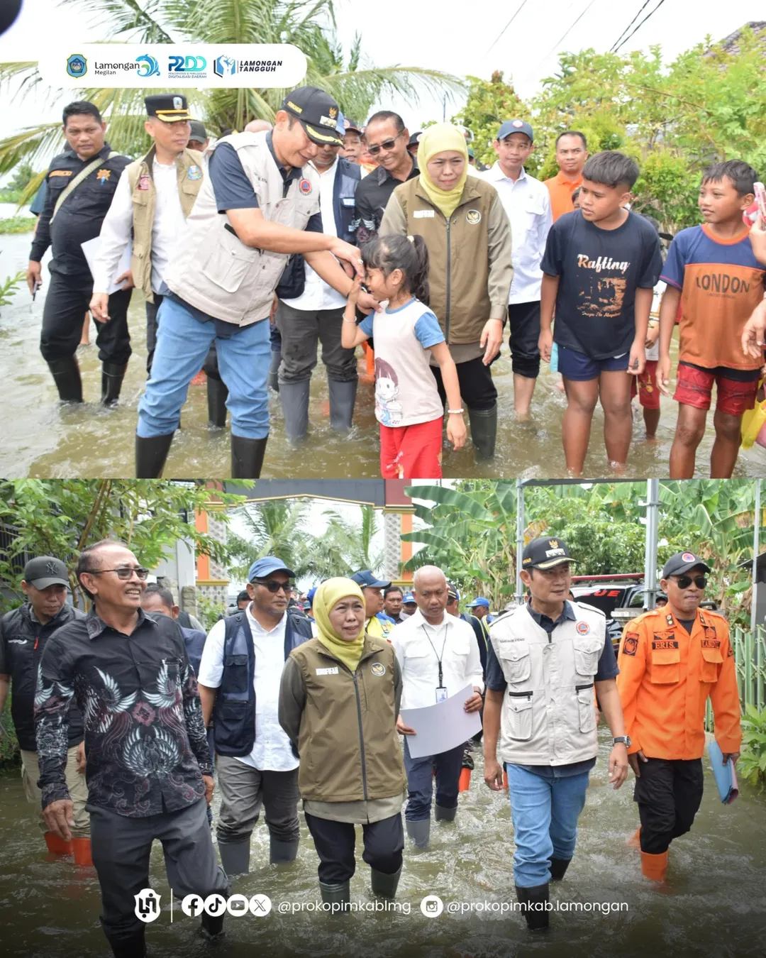 Bupati Lamongan Yuhronur Efendi mendampingi Gubernur Jawa Timur Khofifah Indar Parawansa meninjau langsung pemukiman warga yang terdampak banjir di Desa Laladan, Kecamatan Deket, Sabtu (10/1). Dalam kunjungan tersebut, Gubernur Jawa Timur menyalurkan bantuan bagi warga terdampak sebagai bagian dari respon cepat penanganan banjir, meliputi dukungan logistik pangan, sandang, perlengkapan kebersihan, perlindungan, serta kebutuhan dasar lainnya.
