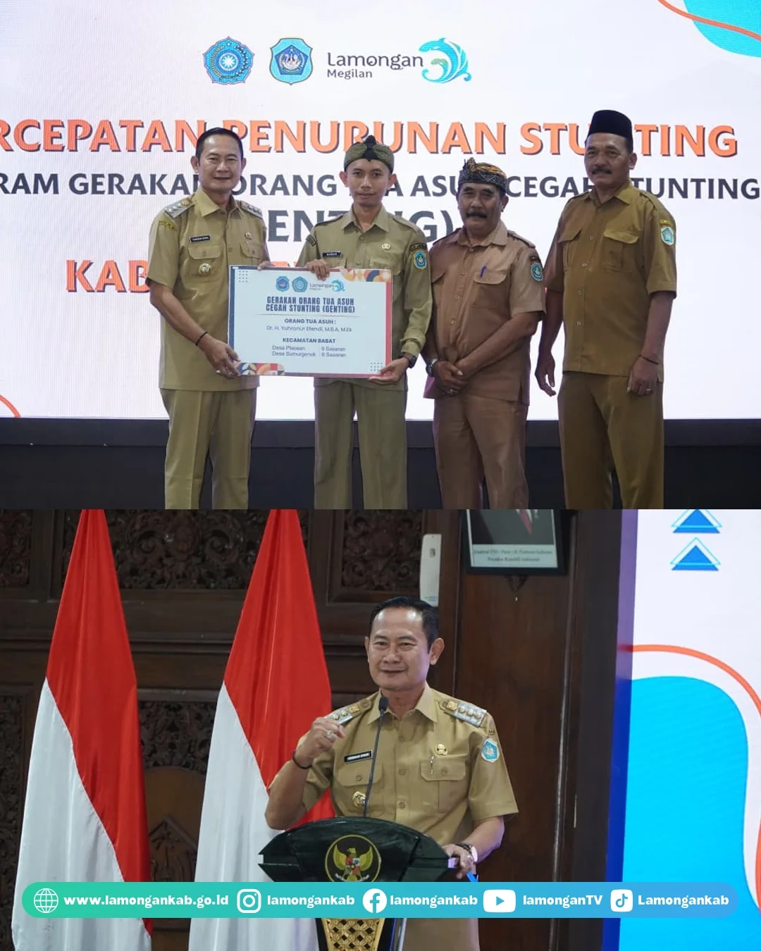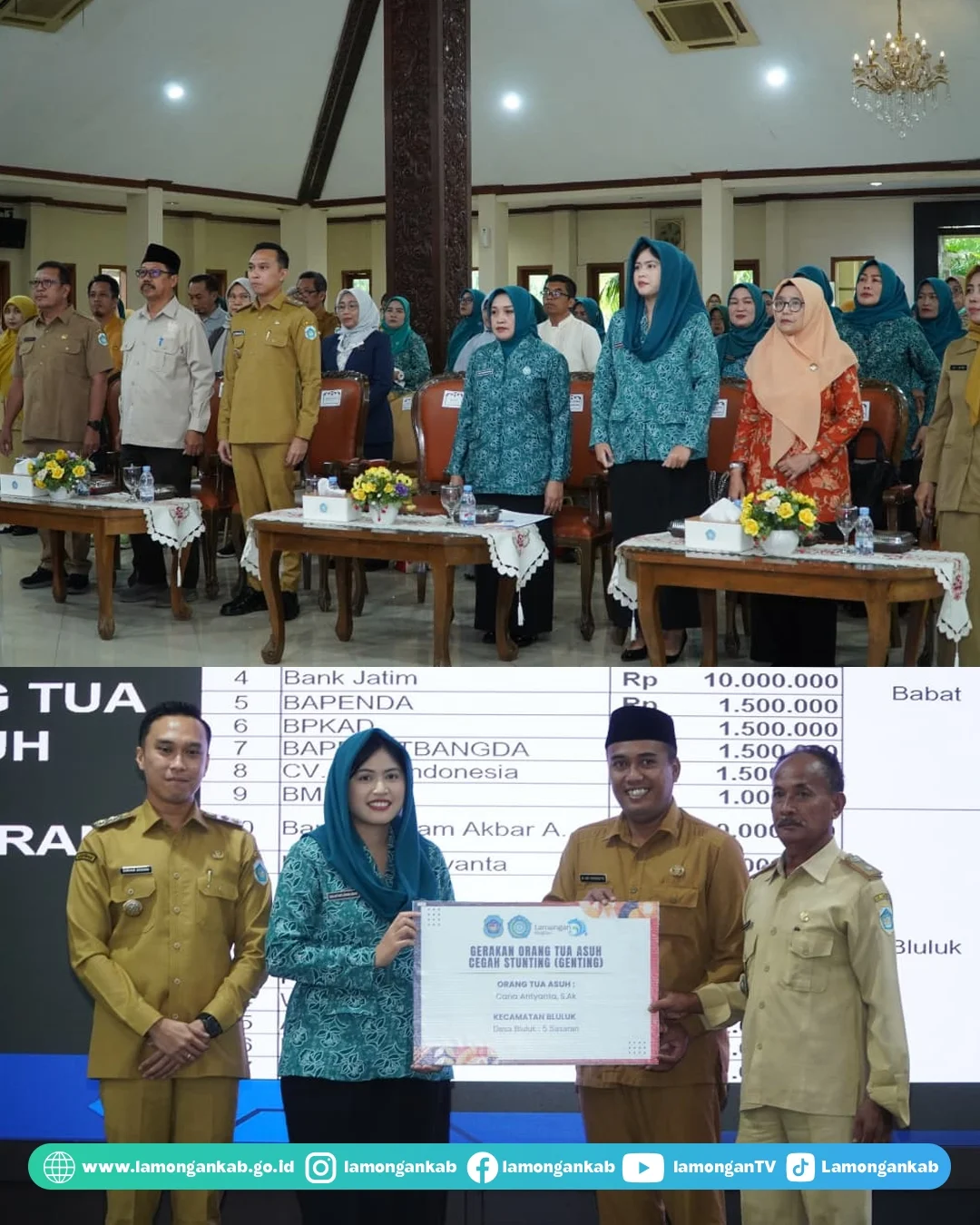 Tim Penggerak PKK Kabupaten Lamongan di bawah komando Ibu Anis Kartika Yuhronur Efendi yang juga merupakan Ketua Genting Lamongan, menyalurkan bantuan Program Genting (Gerakan Orang Tua Asuh Cegah Stunting) sebesar Rp. 190.253.000 untuk 159 balita stunting dan 30 ibu hamil rentan di Lamongan. Bantuan ini diserahkan secara simbolis pada Selasa (13/1) di Pendopo Lokatantra Lamongan.