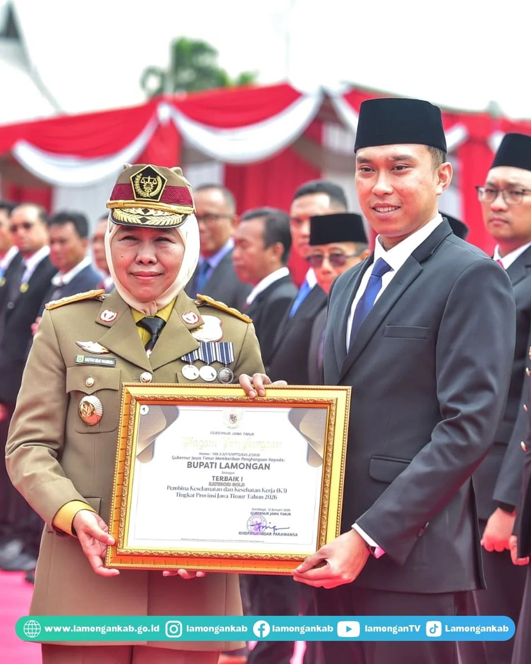 Sebanyak 64 penghargaan Keselamatan dan Kesehatan Kerja (K3) (penilaian tahun 2025) berhasil dibawa pulang oleh Pemerintah Kabupaten Lamongan beserta 33 perusahaan di Kabupaten Lamongan.