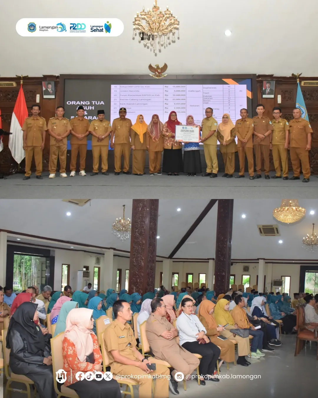 Bupati Lamongan Yuhronur Efendi menyerahkan bantuan Program Genting (Gerakan Orang Tua Asuh Cegah Stunting) Periode II secara simbolis kepada Camat serta Kepala Desa dan Lurah di Pendopo Lokatantra, Selasa (13/1). Implementasi Genting di Lamongan menunjukkan dampak awal yang positif, setelah pada Periode I (September–Desember 2025) mayoritas baduta (bayi di bawah dua tahun) penerima bantuan mengalami peningkatan berat dan tinggi badan.