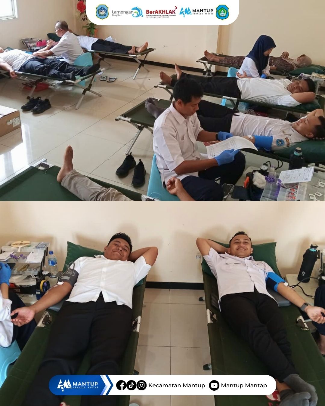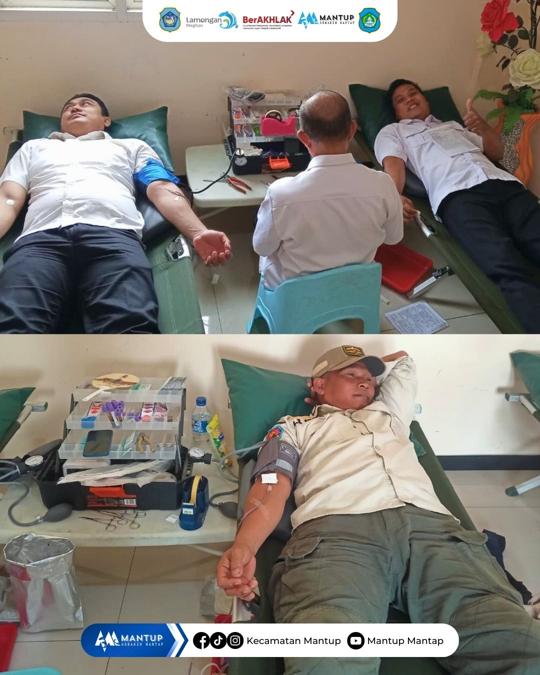 Staf Kecamatan Mantup turut serta dalam kegiatan donor darah yang diselenggarakan oleh Palang Merah Indonesia (PMI) Kabupaten Lamongan yang dilaksanakan pada Rabu (21/1) di Puskesmas Mantup. Kegiatan ini dilaksanakan sebagai bentuk kepedulian sosial serta dukungan terhadap upaya pemenuhan kebutuhan stok darah di wilayah Kabupaten Lamongan.