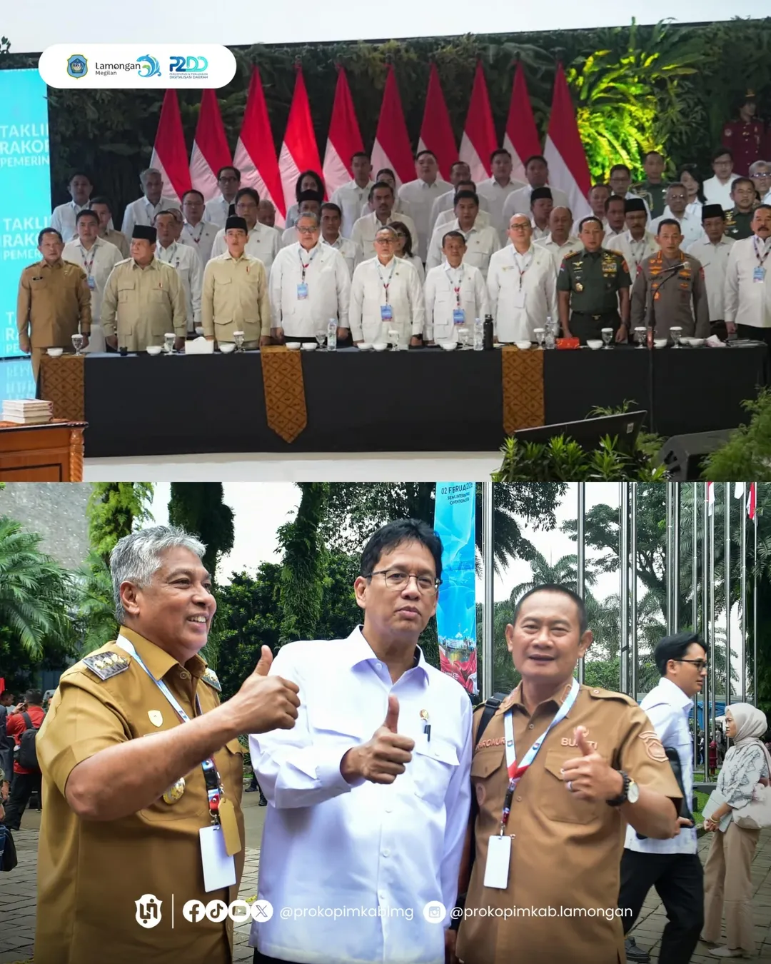 Bupati Lamongan, Yuhronur Efendi, bersama jajaran Forum Koordinasi Pimpinan Daerah (Forkopimda) menghadiri Rapat Koordinasi Nasional (Rakornas) Pemerintah Pusat dan Pemerintah Daerah Tahun 2026 yang dibuka langsung oleh Presiden Prabowo Subianto di Sentul International Convention Center (SICC), Bogor, Senin (2/2). Kegiatan ini bertujuan untuk memperkuat sinergi antara kebijakan Pemerintah Kabupaten Lamongan dengan visi pembangunan nasional menuju Indonesia Emas 2045.