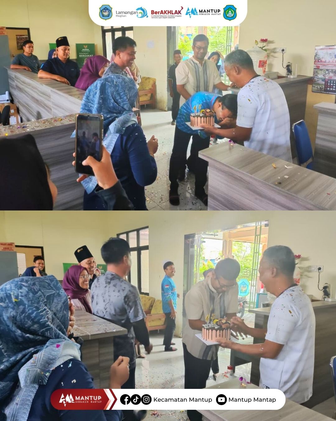 Suasana hangat dan penuh kebersamaan mewarnai perayaan Hari Ulang Tahun ke-54 Camat Mantup yang dilaksanakan di lingkungan Kantor Kecamatan Mantup. Kegiatan tersebut dihadiri oleh Sekretaris Kecamatan, para Kepala Seksi, staf kecamatan, serta perwakilan perangkat desa.