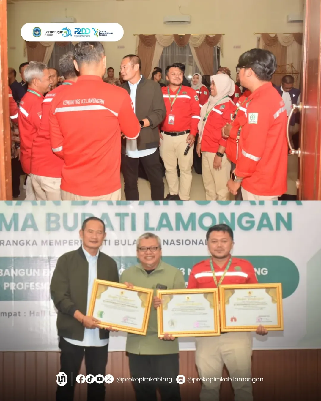 Pada kesempatan tersebut, Bupati Lamongan bersama Wakil Bupati Dirham Akbar Aksara turut menyerahkan penghargaan K3 Nasional Tahun 2026 kepada sejumlah perusahaan dan institusi di Lamongan. Penghargaan yang diserahkan meliputi kategori Panitia Pembina Keselamatan dan Kesehatan Kerja (P2K3), Program Pencegahan dan Penanggulangan HIV/AIDS (P2HIV/AIDS), serta penghargaan Zero Accident bagi perusahaan yang berhasil menerapkan sistem keselamatan kerja tanpa kecelakaan dalam periode penilaian.