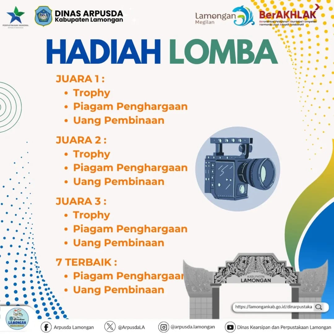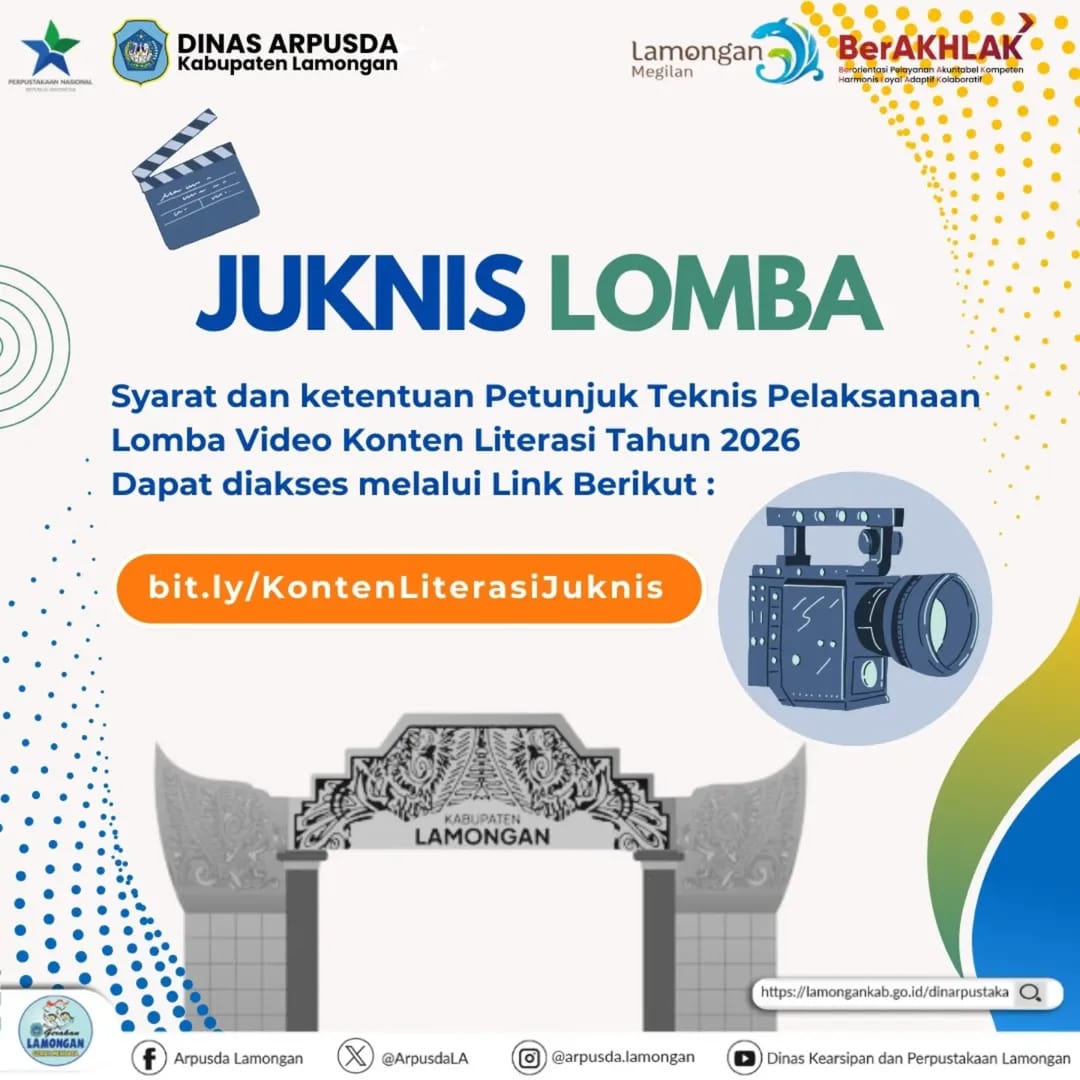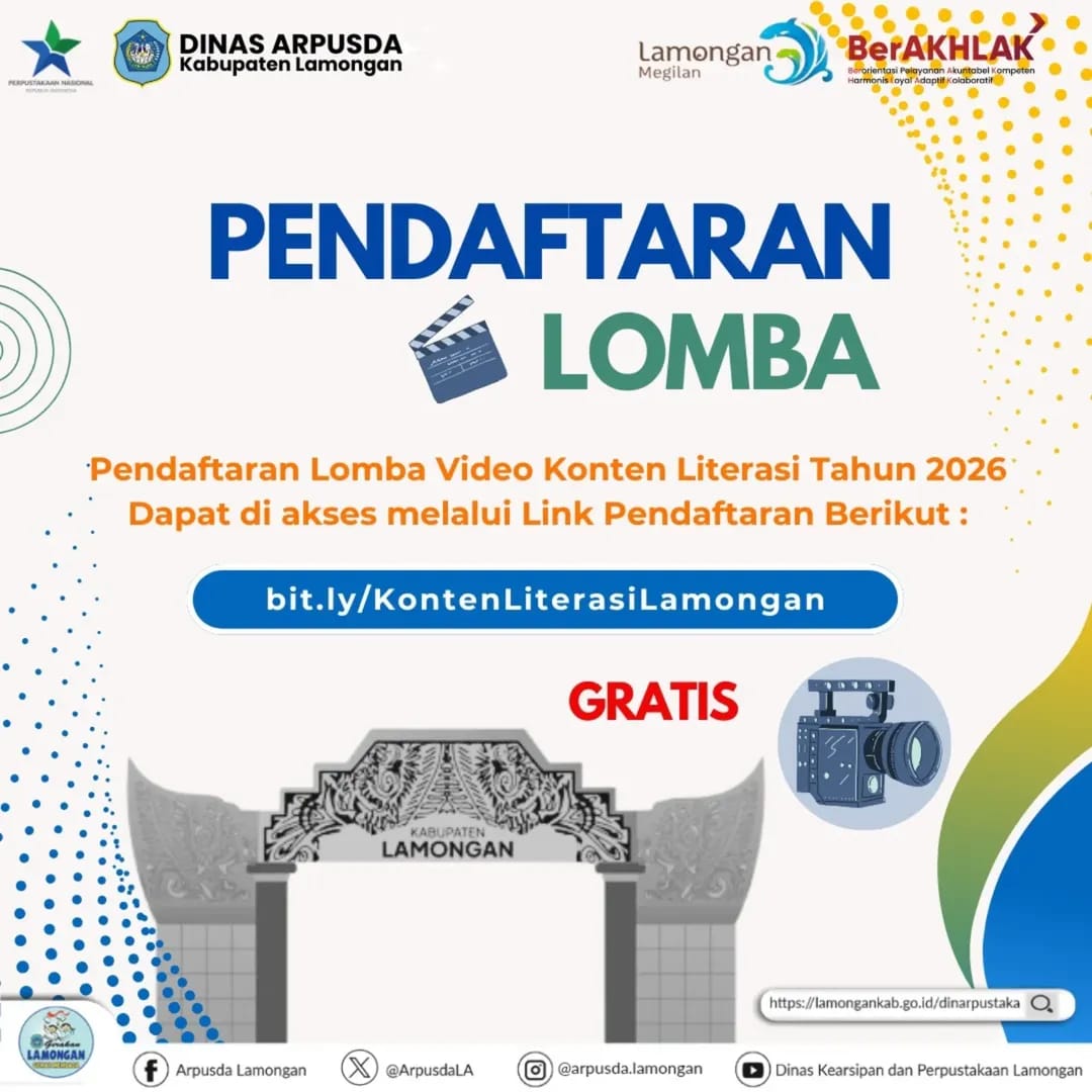 Dalam rangka mempromosikan perpustakaan, budaya baca, dan literasi, Dinas Arpusda Kabupaten Lamongan mengajak masyarakat untuk berpartisipasi dalam Lomba Video Konten Literasi Kabupaten Lamongan Tahun 2026 dengan tema: