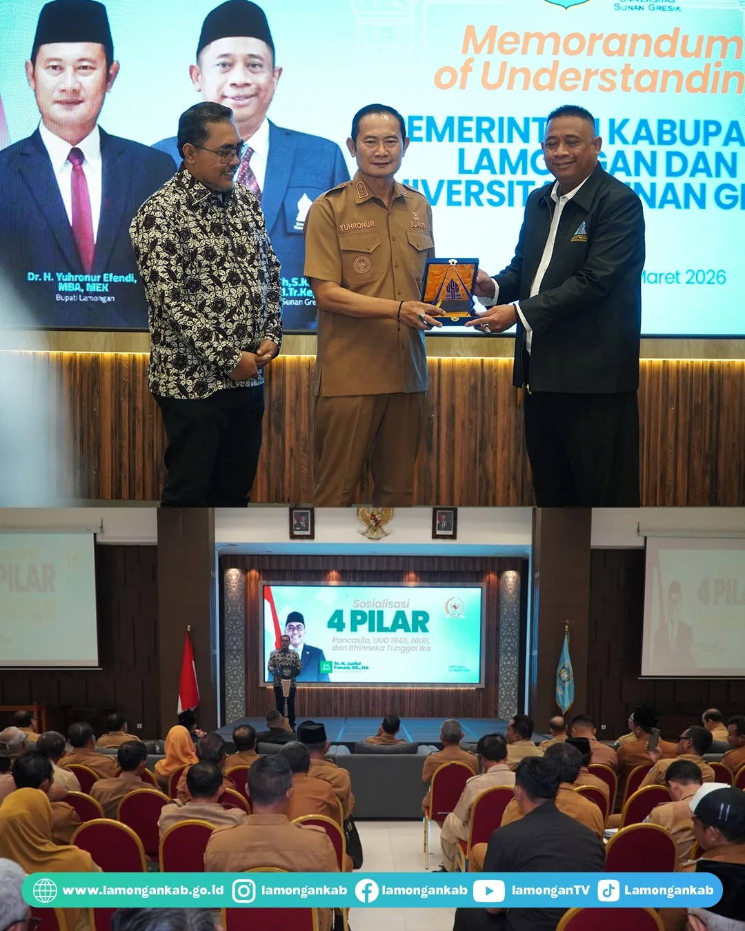 Upaya tersebut diwujudkan melalui kegiatan sosialisasi empat pilar kebangsaan MPR RI sekaligus Penandatanganan Nota Kesepahaman (MoU) antara Pemerintah Kabupaten Lamongan dengan Universitas Sunan Gresik, Senin (2/3) di Aula Gajah Mada Lt.7 Gedung Pemkab Lamongan.