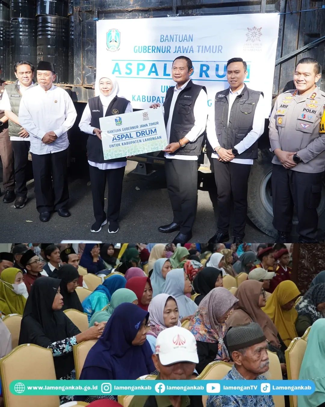Tidak hanya itu, Bu Khofifah juga menyerahkan bantuan program pembinaan jalan kabupaten berupa 300 drum aspal. "Jadi kita sering mendapat laporan jalan rusak, apalagi karena musim hujan. Ini sistemnya kita sharing Pak Bupati, jadi kami bahannya nanti dari kabupaten tenaganya. Terima kasih, semoga semuanya ini dapat memberi manfaat" ungkapnya.