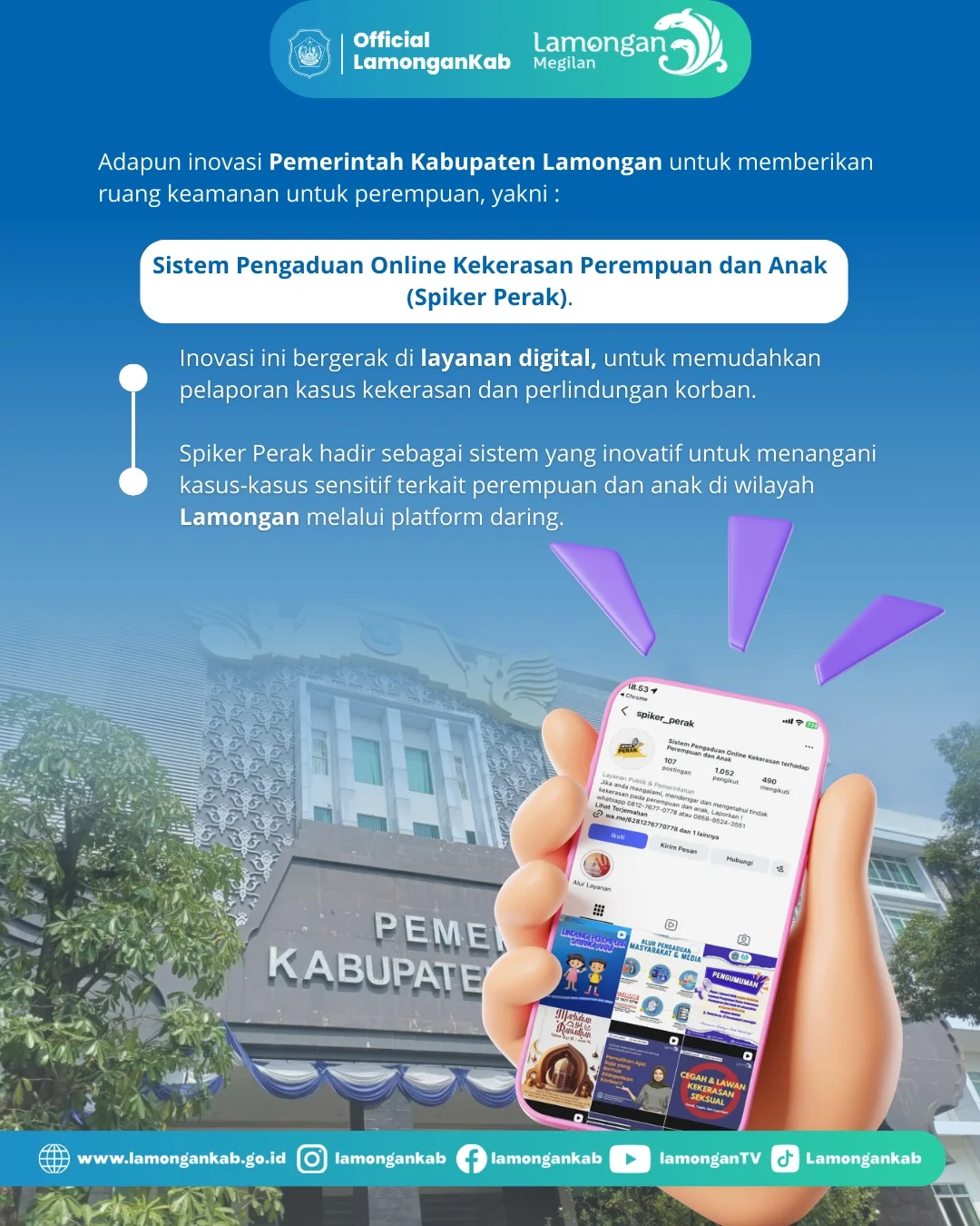 Melalui inovasi Sistem Pengaduan Online Kekerasan Perempuan dan Anak (Spiker Perak), Pemerintah Kabupaten Lamongan berkomitmen memberikan ruang perlindungan dan akses pelaporan yang lebih mudah bagi masyarakat.