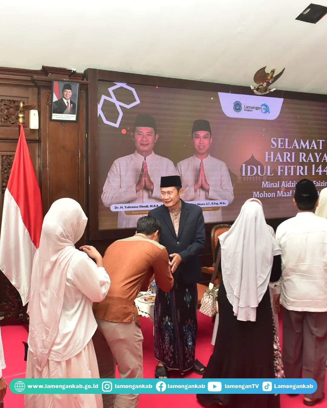 Usai pelaksanaan salat, kegiatan dilanjutkan dengan open house Hari Raya Idul Fitri yang digelar mulai pukul 07.00 WIB di Pendopo Lokatantra. Dalam suasana hangat dan penuh kekeluargaan, Bupati Lamongan yang akrab disapa Pak Yes bersama keluarga menyambut kehadiran masyarakat, tokoh agama, tokoh masyarakat, serta jajaran pejabat di lingkungan Pemerintah Kabupaten Lamongan.