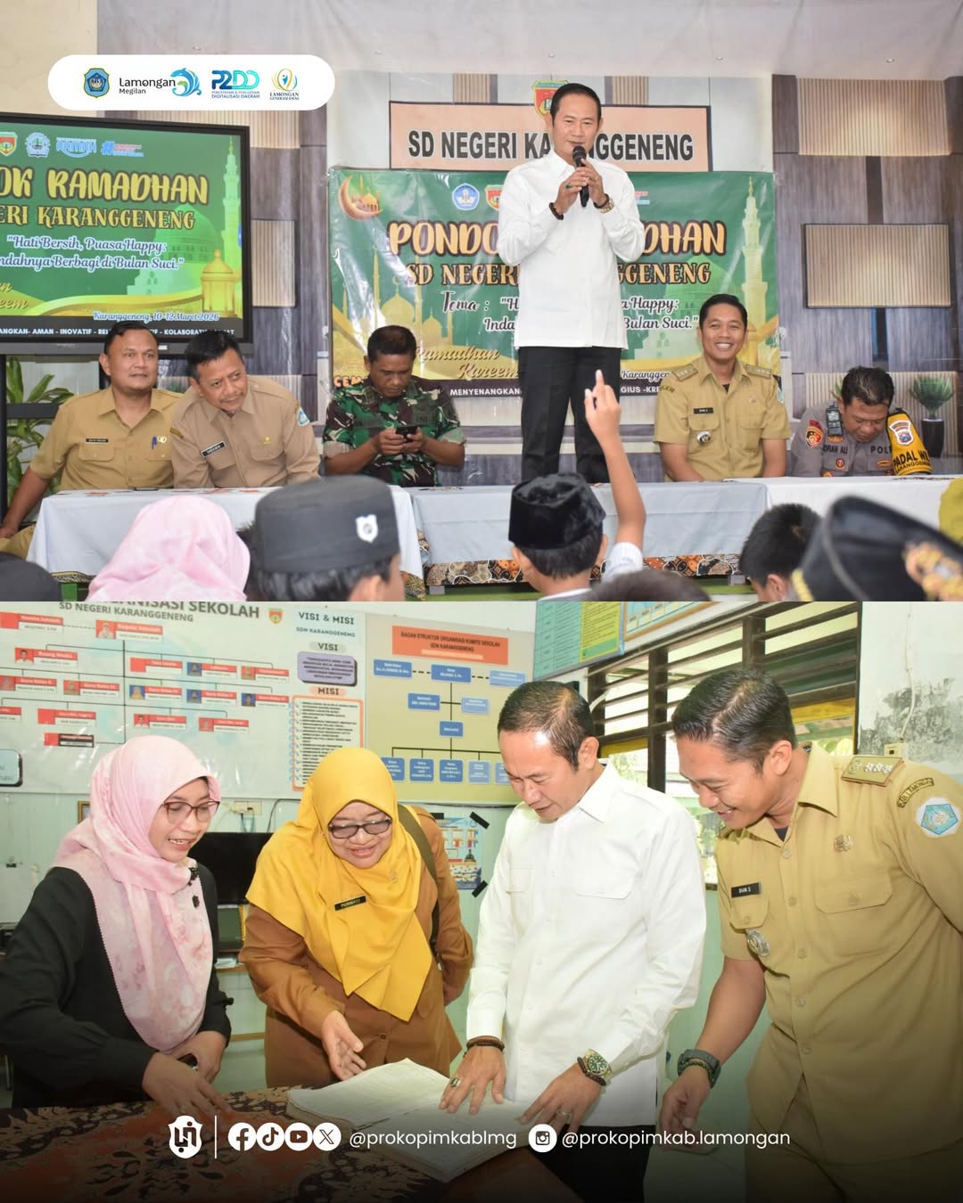 Bupati Lamongan, Yuhronur Efendi melakukan kunjungan kerja ke SDN Karanggeneng dan SD Muhammadiyah 1 Karanggeneng pada Selasa (10/3), untuk meninjau langsung proses kegiatan pendidikan sekaligus memastikan berbagai program Pemerintah Daerah di bidang pendidikan berjalan optimal. Dalam kunjungan tersebut, Pak Yes juga berinteraksi dengan siswa yang tengah mengikuti kegiatan Pondok Ramadan, sekaligus menyapa para guru dan memantau kondisi fasilitas sekolah guna memastikan kegiatan belajar mengajar di sekolah-sekolah Kabupaten Lamongan berjalan dengan baik serta didukung sarana prasarana yang memadai.