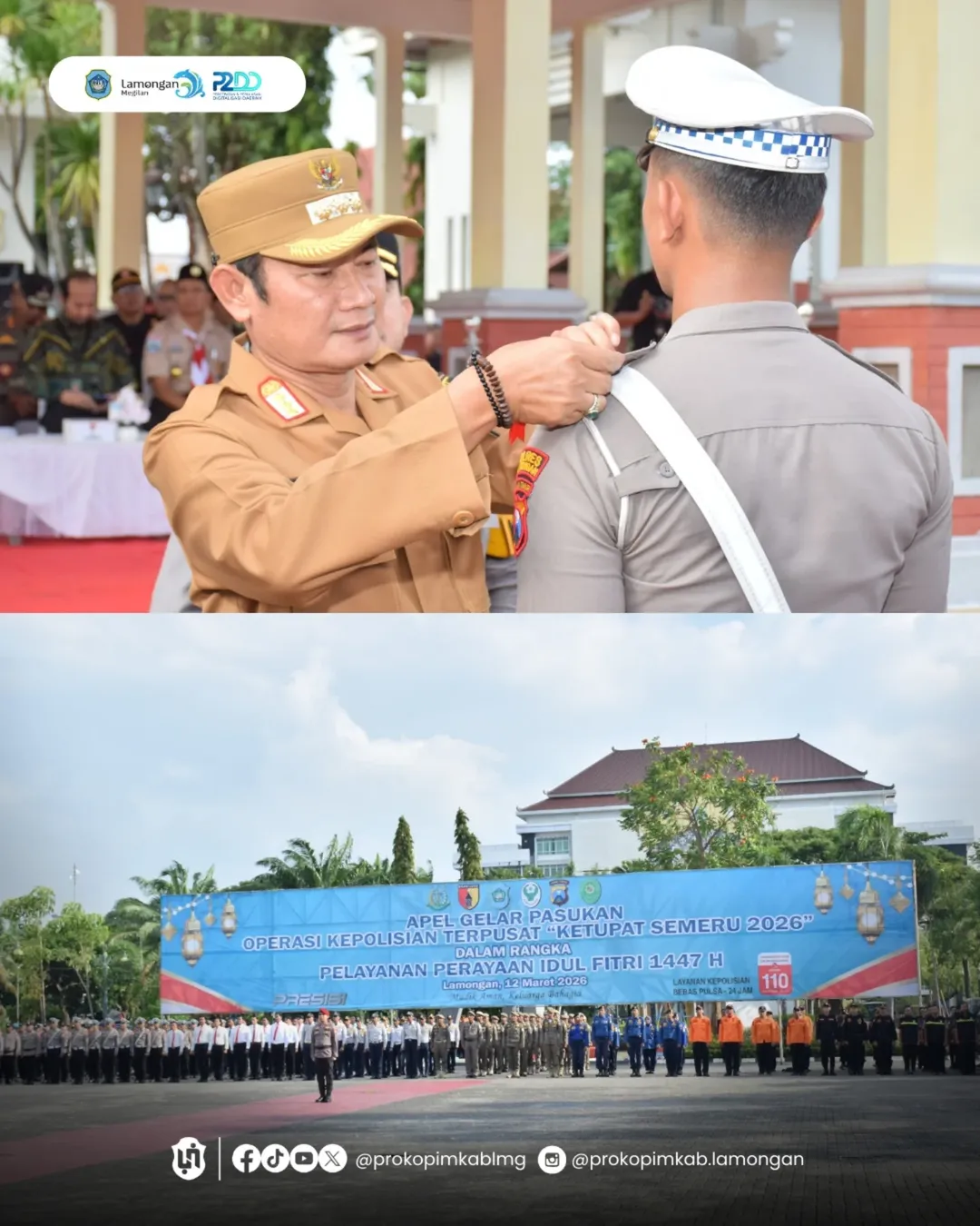 Pemerintah Kabupaten Lamongan bersama jajaran Forkopimda bergerak cepat memastikan kesiapan pengamanan Idul fitri 1447 H. Bupati Lamongan, Yuhronur Efendi memimpin langsung Apel Gelar Pasukan Operasi Ketupat Semeru 2026 di Alun-Alun Lamongan, Kamis (12/3).