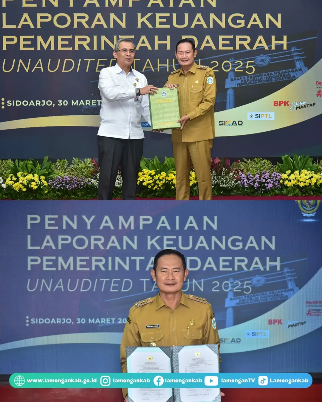 Bupati Lamongan Yuhronur Efendi pada Senin (30/3) menyerahkan Laporan Keuangan Pemerintah Daerah (LKPD) Unaudited Tahun Anggaran 2025 kepada pada Kepala Badan Pemeriksa Keuangan (BPK) Perwakilan Provinsi Jawa Timur Yuan Candara Djaisin, di Sidoarjo. Dalam kesempatan tersebut hadir pula Gubernur Jawa Timur Khofifah Indar Parawansa, menekankan tentang pentingnya akuntabilitas, transparansi, dan ketepatan sasaran program serta kegiatan daerah.