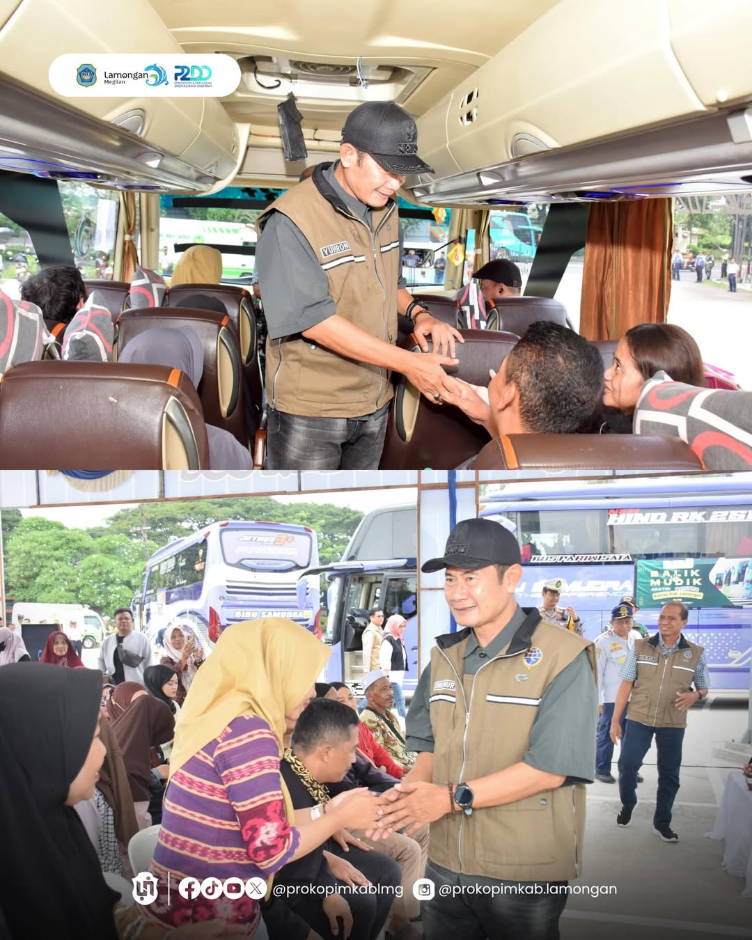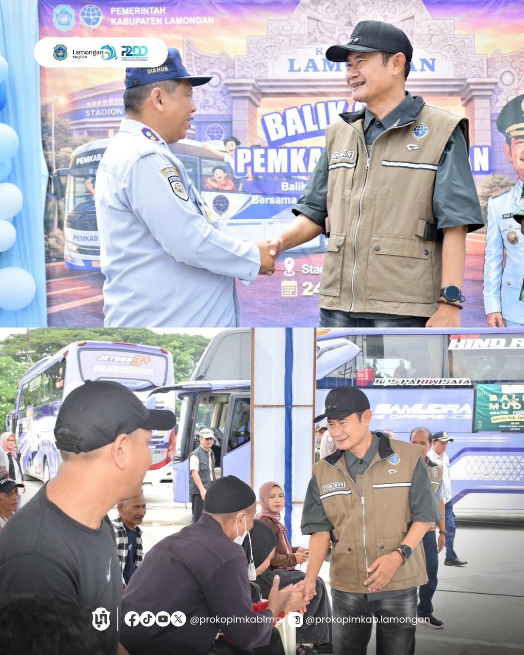 Bupati Lamongan, Yuhronur Efendi secara langsung memberangkatkan peserta program balik gratis bersama Pemerintah Kabupaten Lamongan di Stadion Surajaya Lamongan, Selasa (24/3). Program tersebut menjadi bentuk pelayanan Pemerintah Kabupaten Lamongan dalam memfasilitasi masyarakat yang kembali ke perantauan setelah merayakan Hari Raya Idul Fitri di kampung halaman.