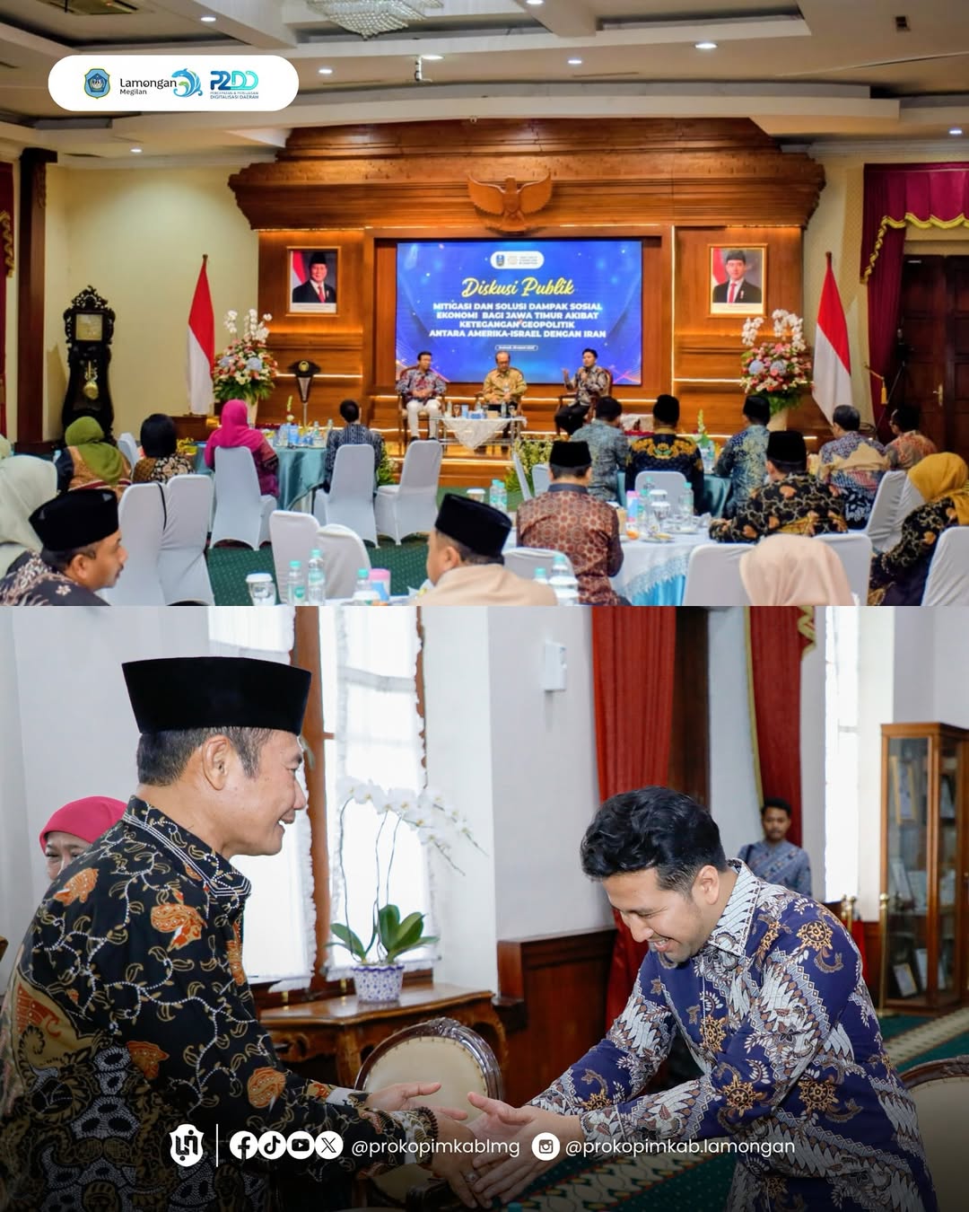 Bupati Lamongan, Yuhronur Efendi, bersama Ketua TP PKK Kabupaten Lamongan, Anis Kartika Yuhronur Efendi, menghadiri Diskusi Publik terkait Mitigasi dan Solusi Dampak Sosial Ekonomi Jawa Timur Akibat Ketegangan Geopolitik bersama Gubernur Jawa Timur, Khofifah Indar Parawansa, di Gedung Grahadi Surabaya, Rabu (25/3). Pada kesempatan tersebut, dipaparkan berbagai strategi kebijakan daerah, guna menghadapi konflik global yang berpotensi memengaruhi stabilitas ekonomi, ketahanan pangan, serta kesejahteraan masyarakat khususnya di Provinsi Jawa Timur.