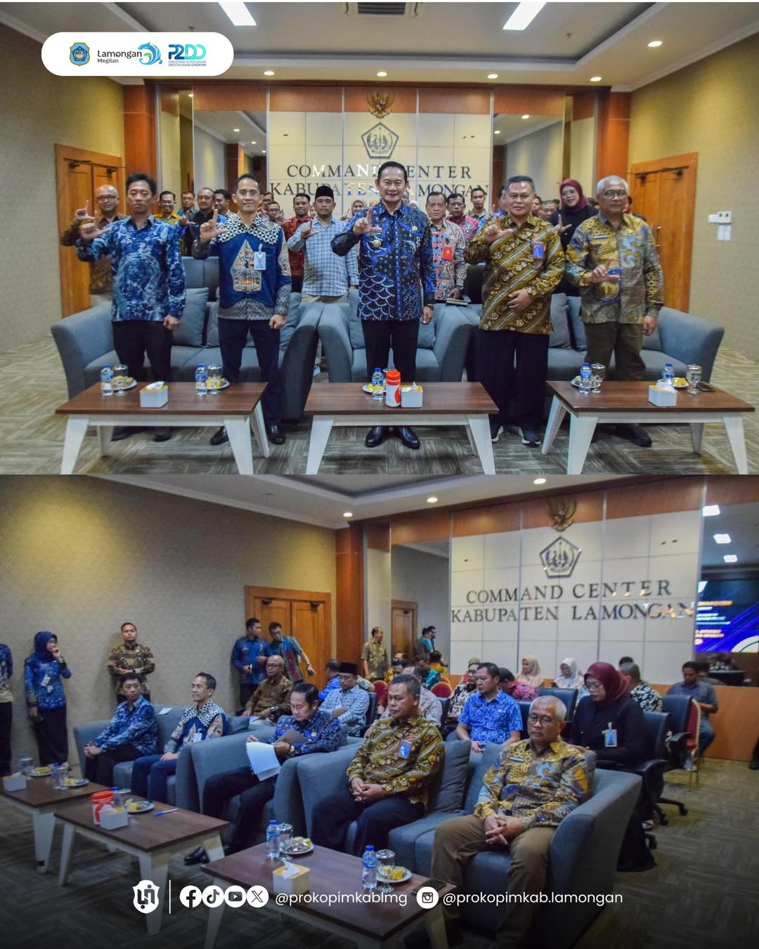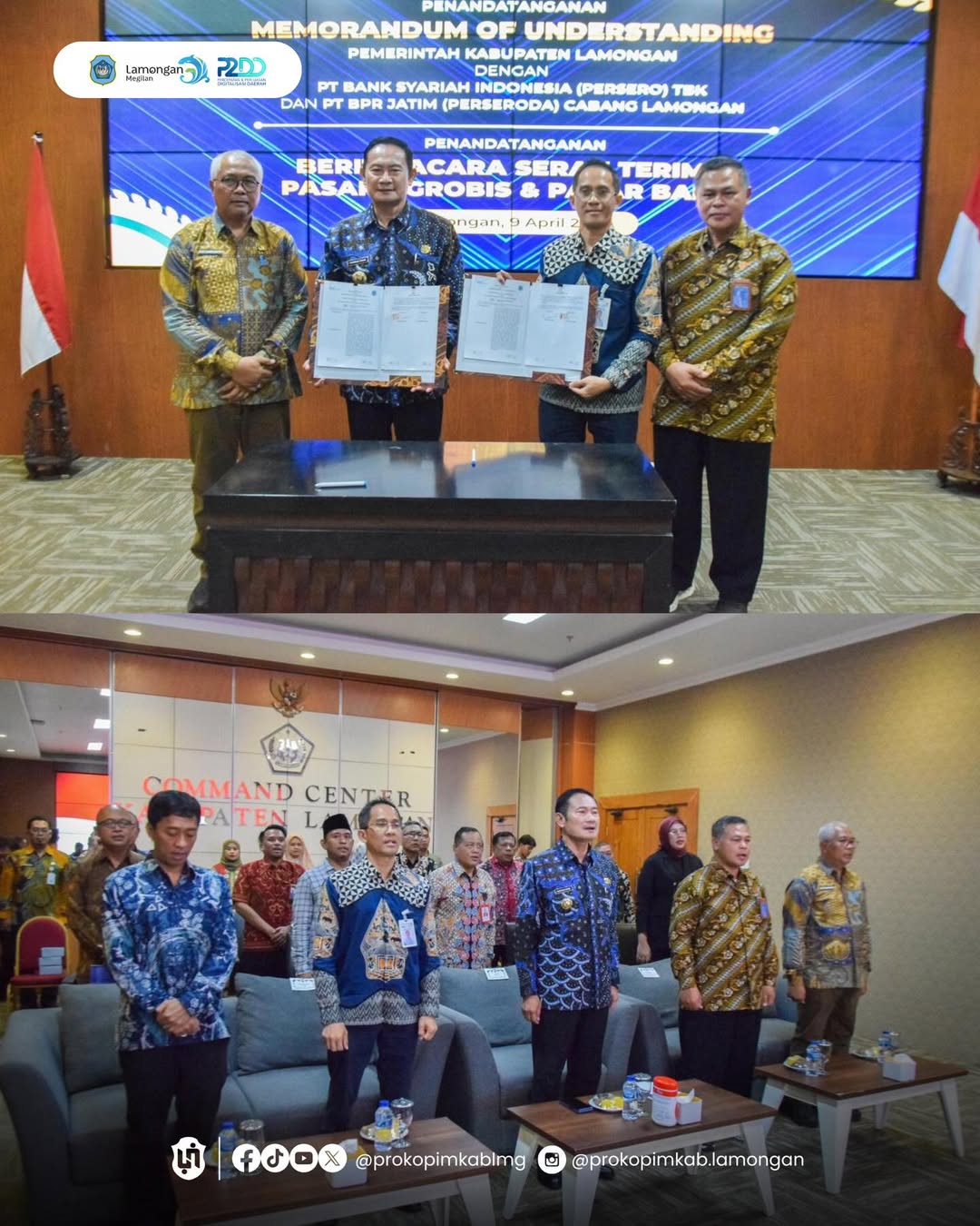 Bupati Lamongan, Yuhronur Efendi, melakukan Penandatanganan Nota Kesepahaman (MoU) antara Pemerintah Kabupaten Lamongan dengan Bank BSI Lamongan dan PT BPR Jatim Cabang Lamongan, serta Penandatanganan Berita Acara Serah Terima (BAST) Pasar Agrobis Babat dan Pasar Babat Modern yang dilakukan antara Pemkab Lamongan dengan PT Karsa Bayu Bangun Perkasa, yang dilaksanakan di Ruang Command Center Lantai 3 Gedung Pemkab Lamongan pada Kamis (9/4), kegiatan ini sebagai upaya memperkuat layanan publik berbasis digital sekaligus mendukung penguatan ekonomi masyarakat di Kabupaten Lamongan.