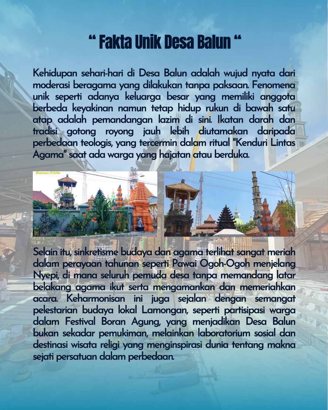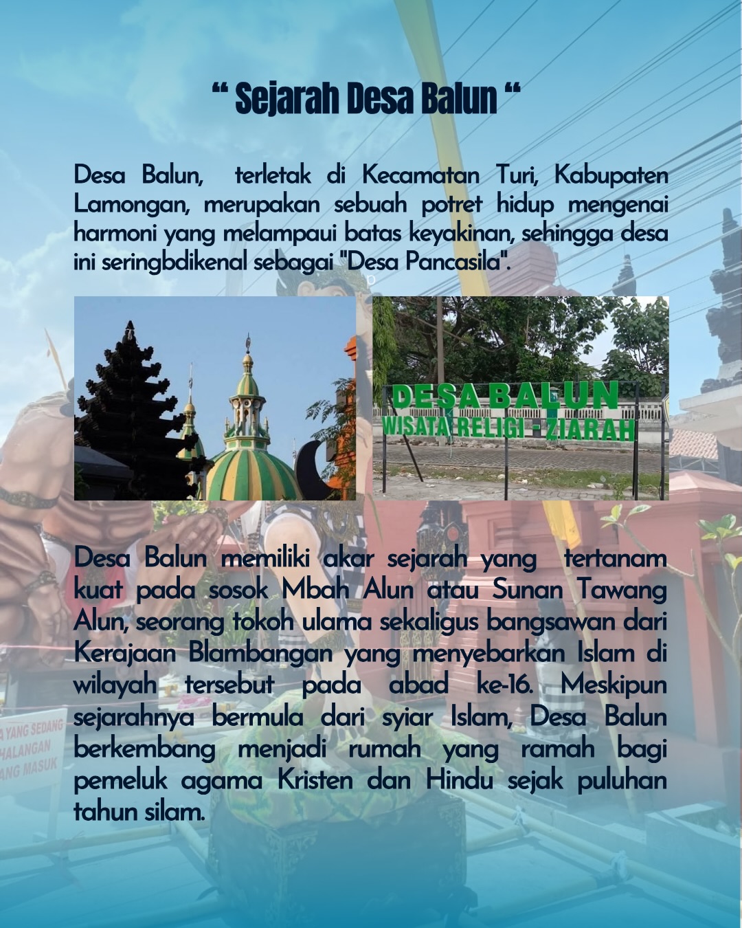 Selamat Datang di Desa Balun, desa yang dikenal luas sebagai “Desa Pancasila” Terletak di Kecamatan Turi, desa ini adalah laboratorium sosial, dimana perbedaan keyakinan bukan menjadi sebuah penghalang, melainkan sebuah warna yang indah.