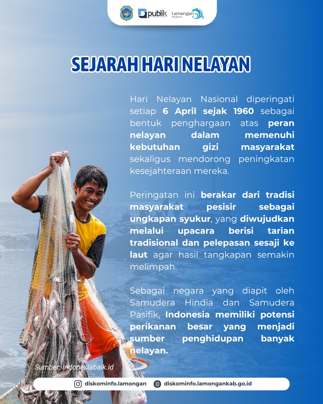 Peringatan ini menjadi momentum untuk mengingat pentingnya peran nelayan sebagai garda depan dalam menjaga ketahanan pangan, memperkuat ekonomi bangsa, serta menegakkan kedaulatan maritim.