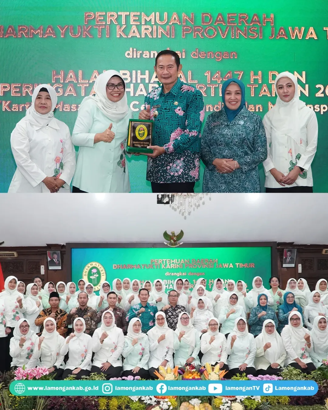 Dharmayukti Karini (DYK) Provinsi Jawa Timur pada Jum'at (10/4) menggelar pertemuan daerah yang dirangkai dengan kegiatan Halal Bihalal 1447 Hijriyah dan Peringatan Hari Kartini Tahun 2026, di Pendopo Lokatantra Lamongan. Bupati Yuhronur Efendi mengatakan bahwa merupakan suatu kehormatan yang luar biasa karena Lamongan dipilih sebagai lokasi penyelenggaraan Pertemuan Daerah Dharmayukti Karini Jatim.